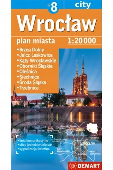 Карта Вроцлава в масштабі від 1 до 20 000, що містить 8 міст поблизу Вроцлава: Бжег Дольний, Єлч-Ласковіце, Конти Вроцлавські, Оборники Сілезькі, Олешніца, Шрода Шльонська, Тшебніца, Сієхніце. Містить лінії зв’язку, вулиці з одностороннім рухом, світлофори.
