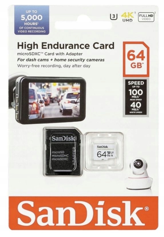 Надійна карта SanDisk microSDHC дозволяє записувати 5000 годин відео у форматі Full HD за допомогою автомобільної камери або домашньої системи спостереження, забезпечуючи постійний запис події в дорозі чи вдома.