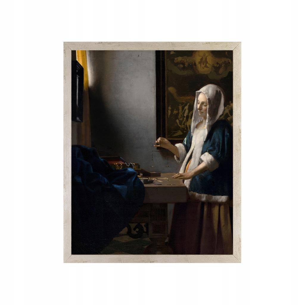 Vrouw met Weegschaal. Жінка тримає ваги. Репродукція картини голландського майстра з Делфта. Оригінальна робота датується 1662–65 роками, колекція Національної галереї мистецтв у Вашингтоні. Вермеер малював не дуже багато картин. Однак зображення було предметом багатьох різних інтерпретацій. Можливо, це портрет самої Пресвятої Матері.