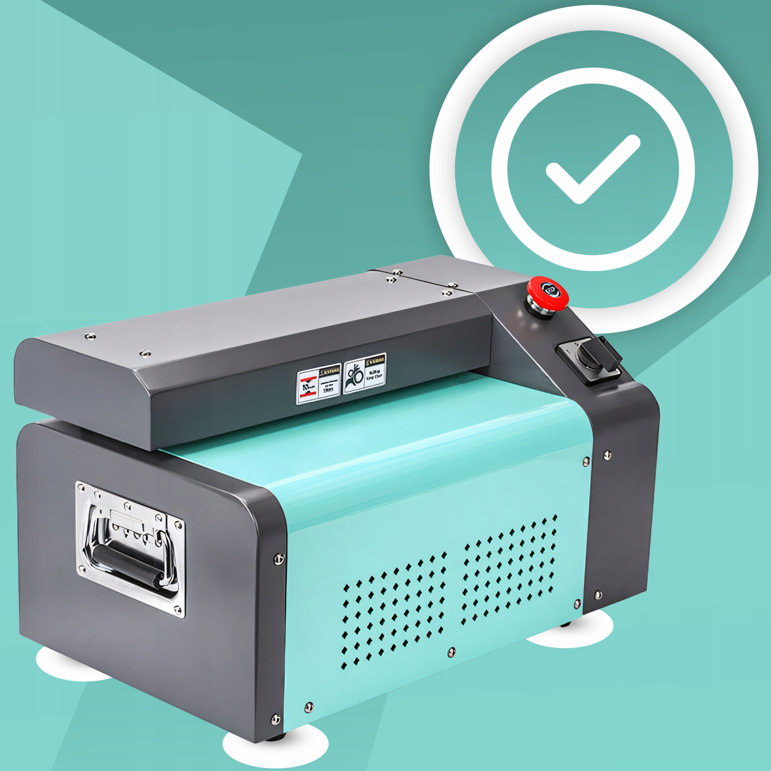 Ручка дозволяє регулювати темп операції залежно від товщини матеріалу, а червона кнопка Stop забезпечує безпеку використання, , що дозволяє негайно зупинити машину , якщо це необхідно.