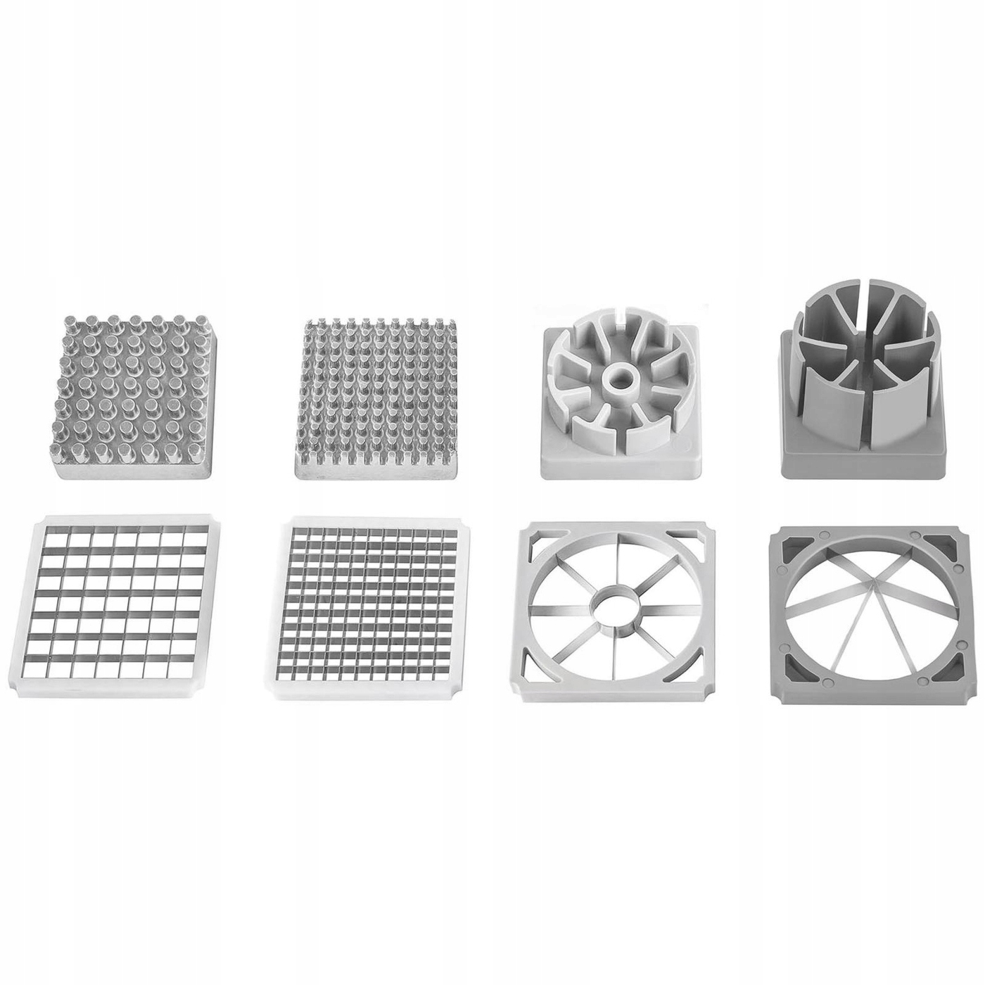 Виберіть з 5 різних картриджів різання з нержавіючої сталі: 3 є квадратними та 2 круглими. Квадратні вставки мають розміри різання 12 х 12 мм, 10 х 10 мм і 8 х 8 мм. Ви будете використовувати їх для вирізання овочів для барів, кубів або фрі.