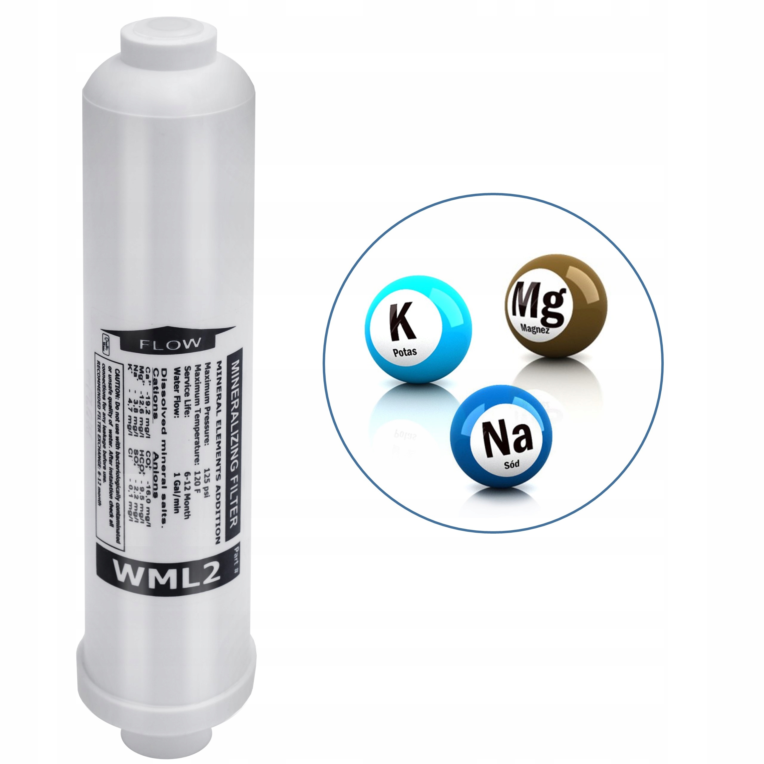 5. WML2- картридж лінійного мінералізатора. Осмотична фільтрація видаляє з води 96-99% усіх домішок і мінералів. Доломітовий мінералізатор WML2 збагачує воду мінералами, втраченими в процесі осмотичної фільтрації. Вода, що протікає через мінералізатор, збагачується необхідними для організму людини елементами, такими як: кальцій, магній, калій, натрій.