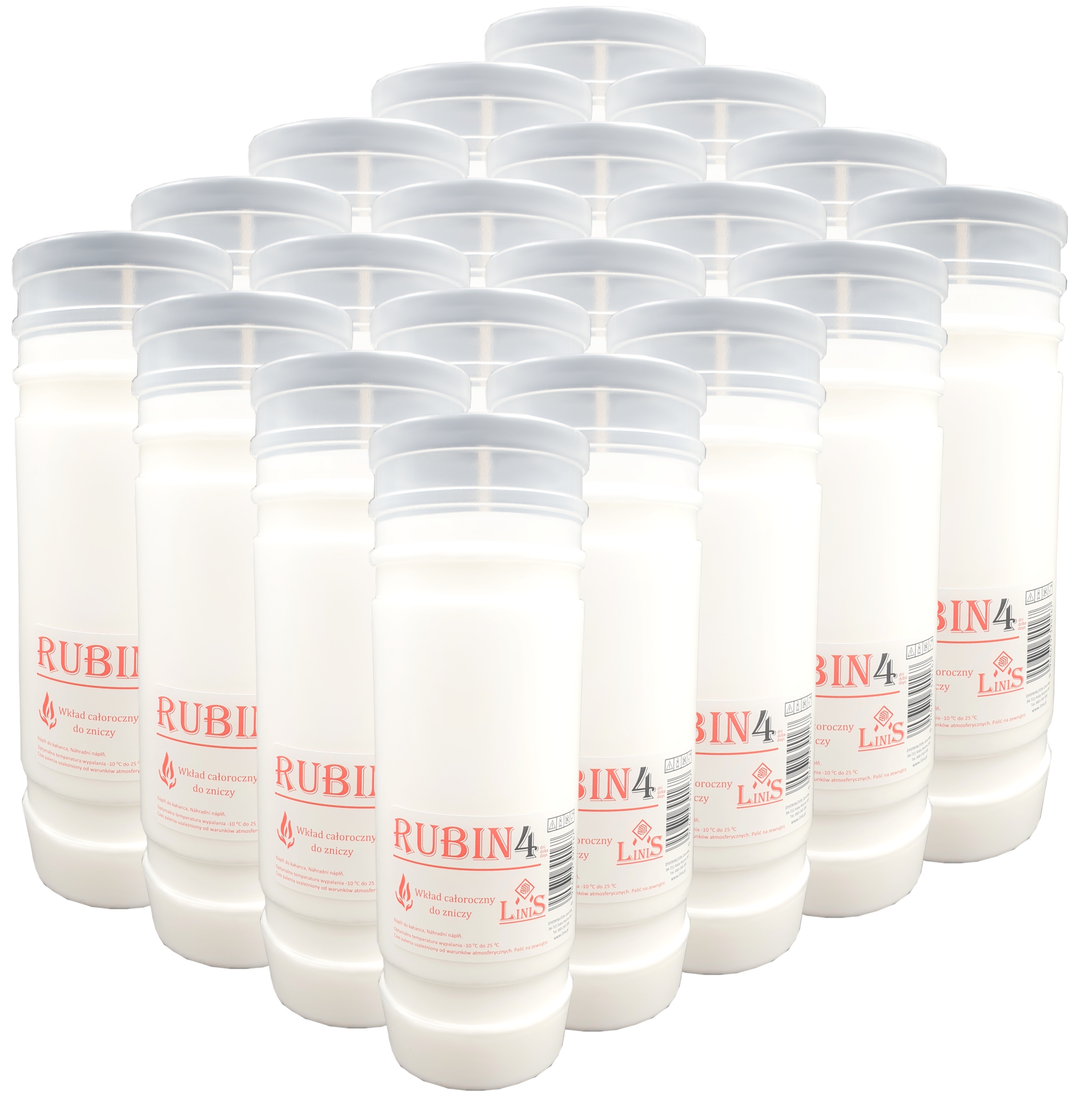 Серія Rubin це економічна версія, яка характеризується найкращою ціною по відношенню до якості вставок, тобто часу горіння та висоти продукту. Вкладиші горять великим полум'ям, яке завжди видно і яскраво, красиво освітлюючи могили наших близьких. Завдяки правильному підбору гніту і парафінової суміші наші вставки не димлять і не забруднюють внутрішню частину свічки. Їх естетичний дизайн робить їх придатними для будь-якого випадку та для будь-якої свічки.