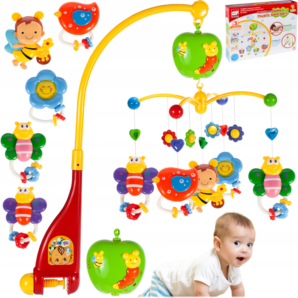 На музичну шкатулку вішаємо платформу з брязкальцями, яка обертається на 360° навколо власної осі під час відтворення мелодій. Мелодії та рухливі елементи додатково привертають увагу дитини. Великою перевагою каруселі є те, що вона може обертатися без жодних звуків.