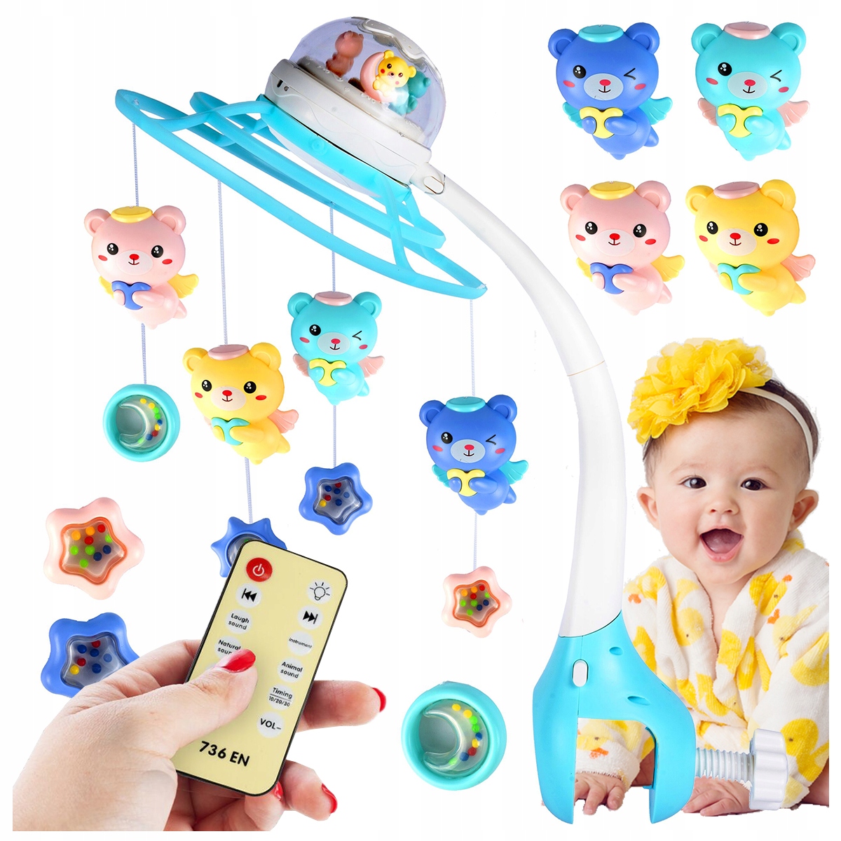 У комплект входить пульт дистанційного керування, який робить керування каруселлю простим і приємним і значно полегшує догляд за дитиною. Пульт дистанційного керування має безліч корисних функцій і дозволяє вибрати будь-яку мелодію, встановити гучність і час роботи каруселі. Тепер вам не потрібно час від часу лягати спати, щоб змінити мелодію, коли дитині нудно.