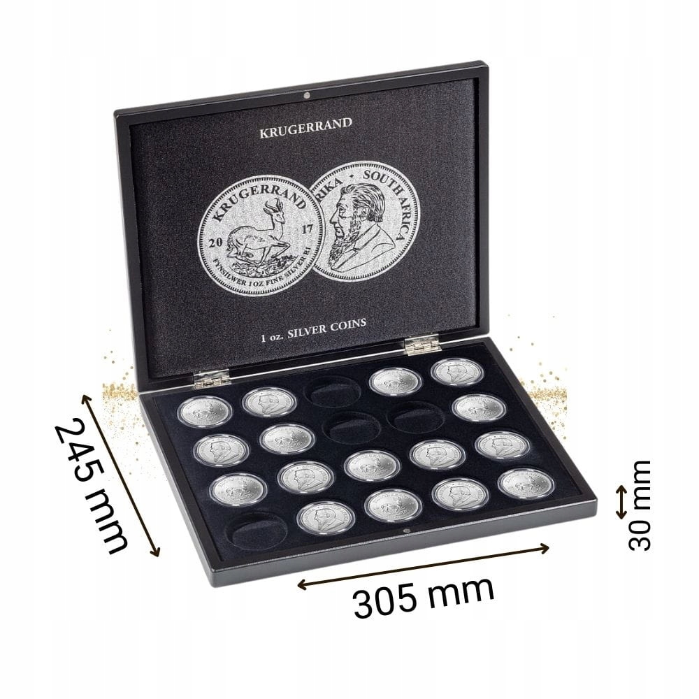 Ми представляємо вам елегантну касету для зберігання срібних монет 1 унції. "Krugerrand", що транслюється монетним двором "Південно -Африканська монета". Касета прекрасно контрастує з монетами, підкреслюючи їх унікальний шарм.