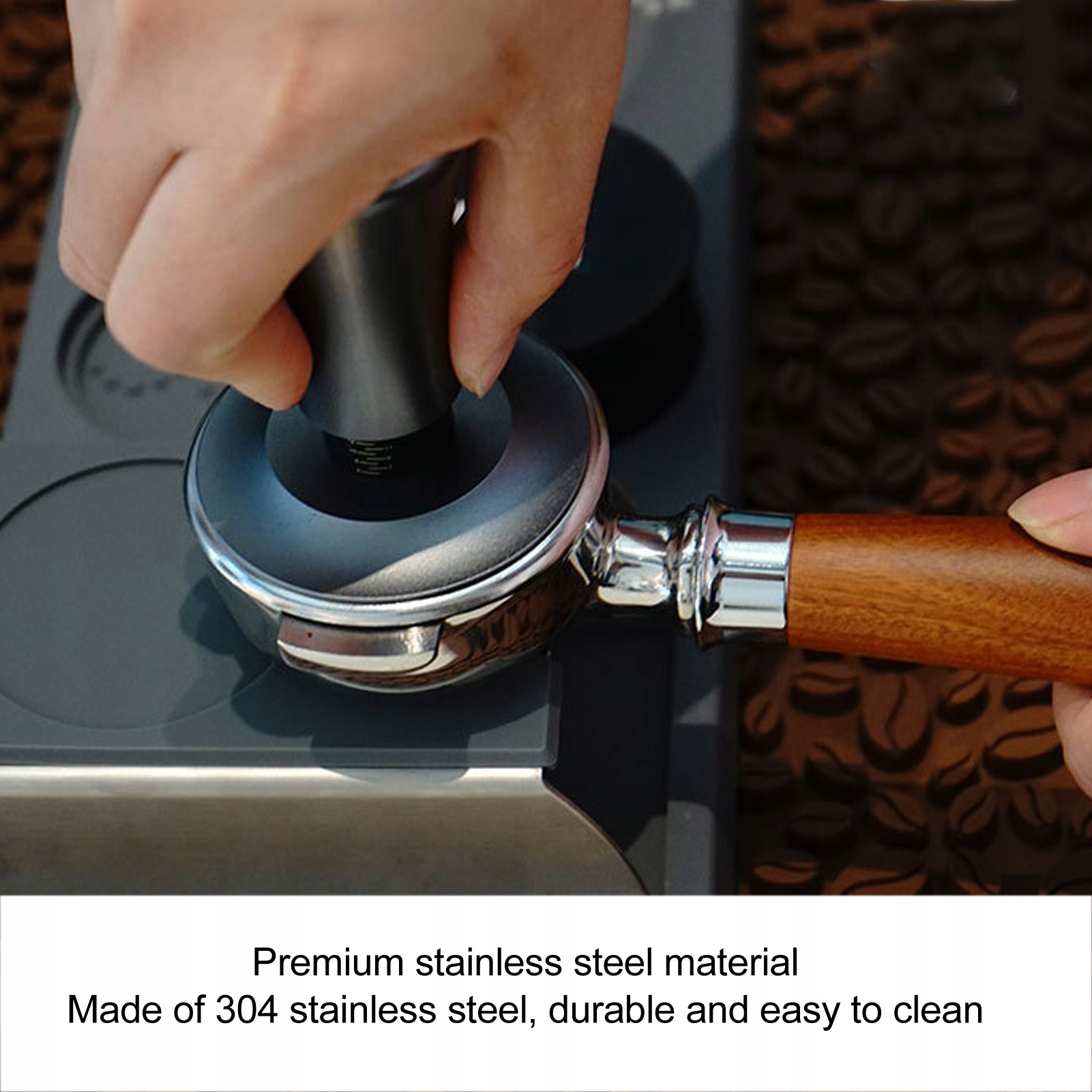 1. МАТЕРІАЛ З НЕРЖАВІЮЧОЇ СТАЛІ: виготовлений із нержавіючої сталі преміум-класу 304, цей тампер для кави не тільки забезпечує міцність і довговічність, але також гарантує гігієнічність і легке очищення.