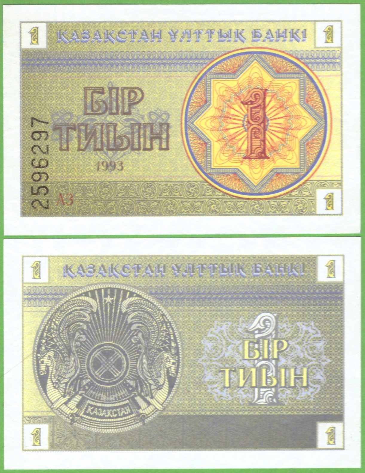 КАЗАХСТАН 1 TYIN 1993 P-1c UNC ВОДЯНИЙ ЗНАК СНІЖИНКА AЗ
