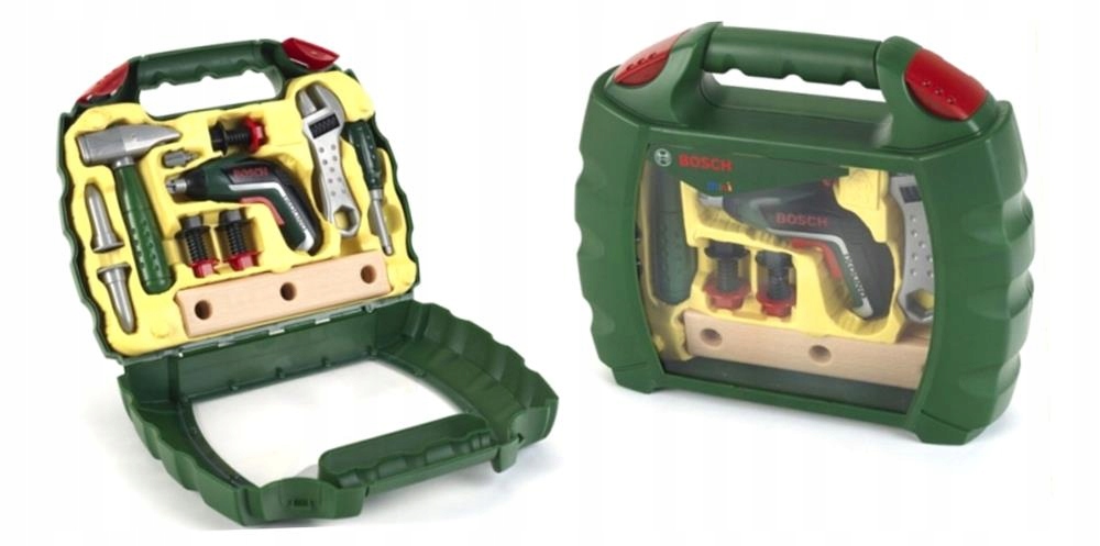 Валіза з викруткою та інструментами Klein походить із серії міні-іграшок Bosch, створених за ліцензією Bosch, тому є копією реально існуючих інструментів цього бренду. Набір упакований в пластиковий футляр темно-зеленого кольору з прозорою передньою панеллю, через яку видно вміст. Валіза має дві червоні засувки з обох сторін профільованої ручки, що захищає інструменти та викрутку від випадкового випадання під час транспортування. У валізі знаходяться інструменти та аксесуари для гри, а основний інструмент - акумуляторна викрутка (KL 8300) Bosch Ixiolino II з однією додатковою змінною насадкою. Викрутка зроблена надійно з великою увагою до деталей, що точно імітує справжній пристрій. Викрутка, як і справжня, має зручну ручку з гумовою поверхнею, яка полегшує утримання іграшки в руках дітей, має можливість перемикати обертання кінчика вправо і вліво за допомогою червоного повзунка, а також діод, який підсвічує місце закручування, розташований над насадкою. Додатково в набір входить ручна пилка, молоток, викрутка, гайковий ключ, дві пластикові дошки з отворами для закручування шурупів, а також 3 шурупа з гайками і 2 пластикових цвяха. Всі елементи набору виготовлені з пластику, без гострих країв і абсолютно безпечні для дитини. Граючи з валізою з інструментами, діти з раннього віку зможуть безпечно грати роль майстра на всі руки, забезпечуючи собі реалістичний досвід використання інструментів набору. Іграшка дозволяє дітям грати творчо та вдосконалювати свої ручні навички. Діти люблять наслідувати або брати участь у виконанні своїх батьків повсякденних домашніх справ, але це не завжди можливо з міркувань безпеки, і завдяки цій абсолютно безпечній для дитини іграшковій валізі з інструментами та викруткою кожен маленький ентузіаст DIY може безпечно робити те, що роблять його опікуни. Для іграшки потрібні батарейки, які не входять в комплект.