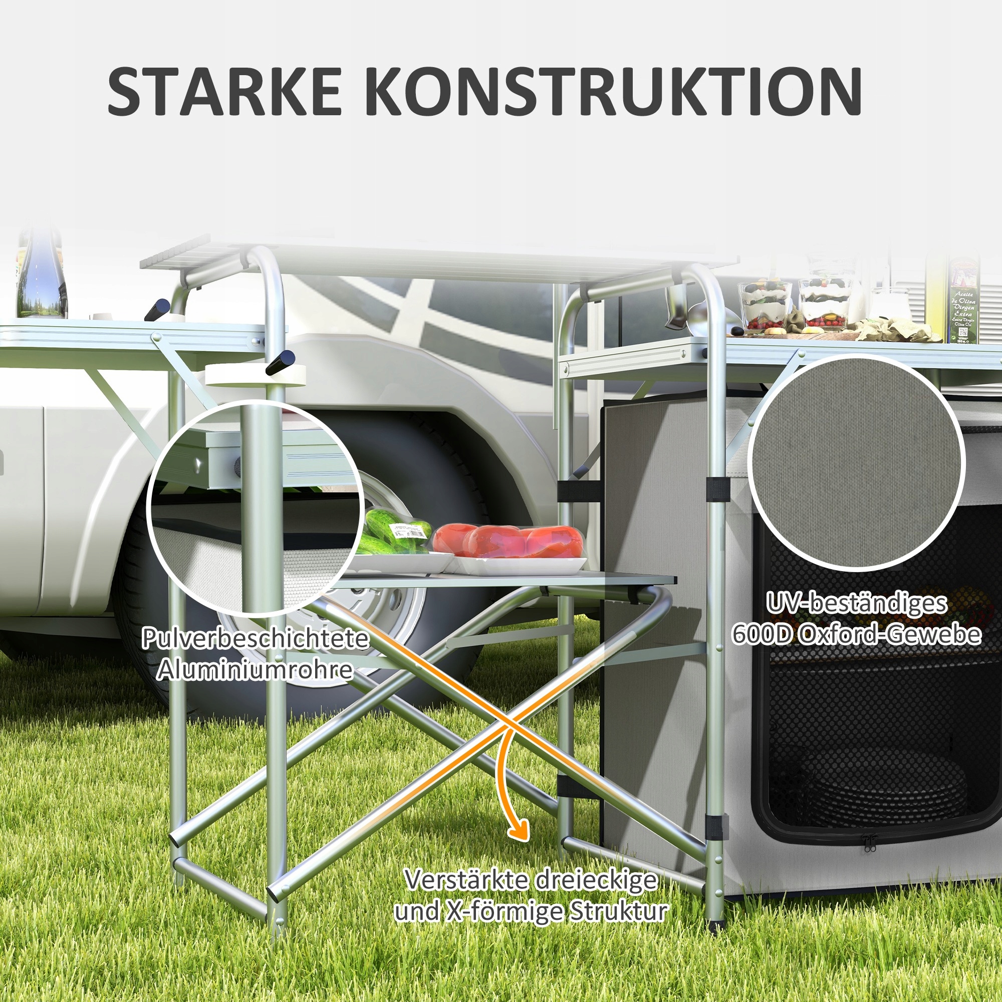 Наша кемпінгова кухня аутсун забезпечує багато місця для кухонних аксесуарів і ідеально підходить для приготування страв на ходу. Відмінне управління простором включає три вершини, нижню полицю, дворівневу тканинну шафу, чотири гачки та регульована підставка лампи. Кемпінг -стіл із простором для зберігання аутсуну допоможе вам підтримувати порядок, завдяки якому ви втратите менше часу на пошук аксесуарів та більше часу, щоб шукати пригоди.