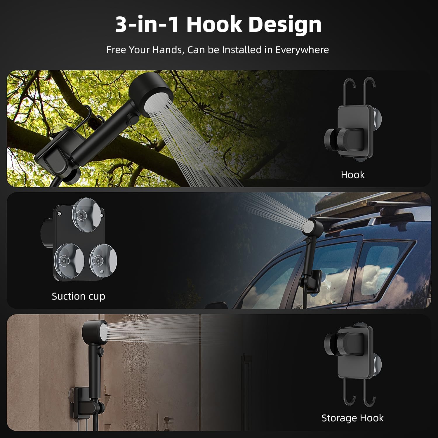 - Електрична душова лійка має п’ять практичних налаштувань подачі води (3 режими душу + струменевий режим – душова лійка + окремий пістолет-розпилювач) і регульовану швидкість потоку води, за допомогою якої можна легко перемикатися між різними швидкостями та режимами душу, повертаючи задню/передню ручку душової лійки, відповідно до потреб різних сценаріїв. Оснащений гачком 3-в-1 і присоскою, він дозволяє безпечно повісити душову лійку на гілки дерев, підставки для наметів, автомобілі або встановити її на вікна автомобіля.