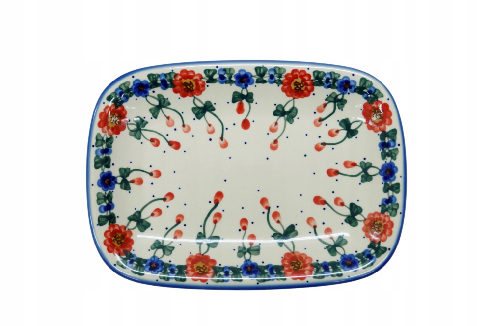 Блюдо довжиною до 24,5 см у формі прямокутника з краєм вниз, ідеальне поєднання декоративного та функціонального елемента. Унікальна форма, яка підходить до будь-якого інтер’єру та гармонує з керамічним посудом інших виробників з Болеславця. Він чудово поєднується з іншими елементами посуду з Болеславецького гончарного посуду, створюючи ідеальний набір столових і кавових сервізів, про які ви напевно чули - адже вони надзвичайно популярні серед гастрономів і домашніх кухарів.