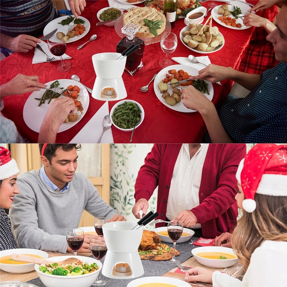 🍪🍪 Набір для фондю 7 в 1 – містить керамічну кружку та блюдце, чотири виделки з нержавіючої сталі та чайну свічку. Цей набір для фондю допоможе вам приготувати простий, але приємний десерт для вечірки, ідеально підходить для чотирьох осіб або як вишукану закуску для двох.