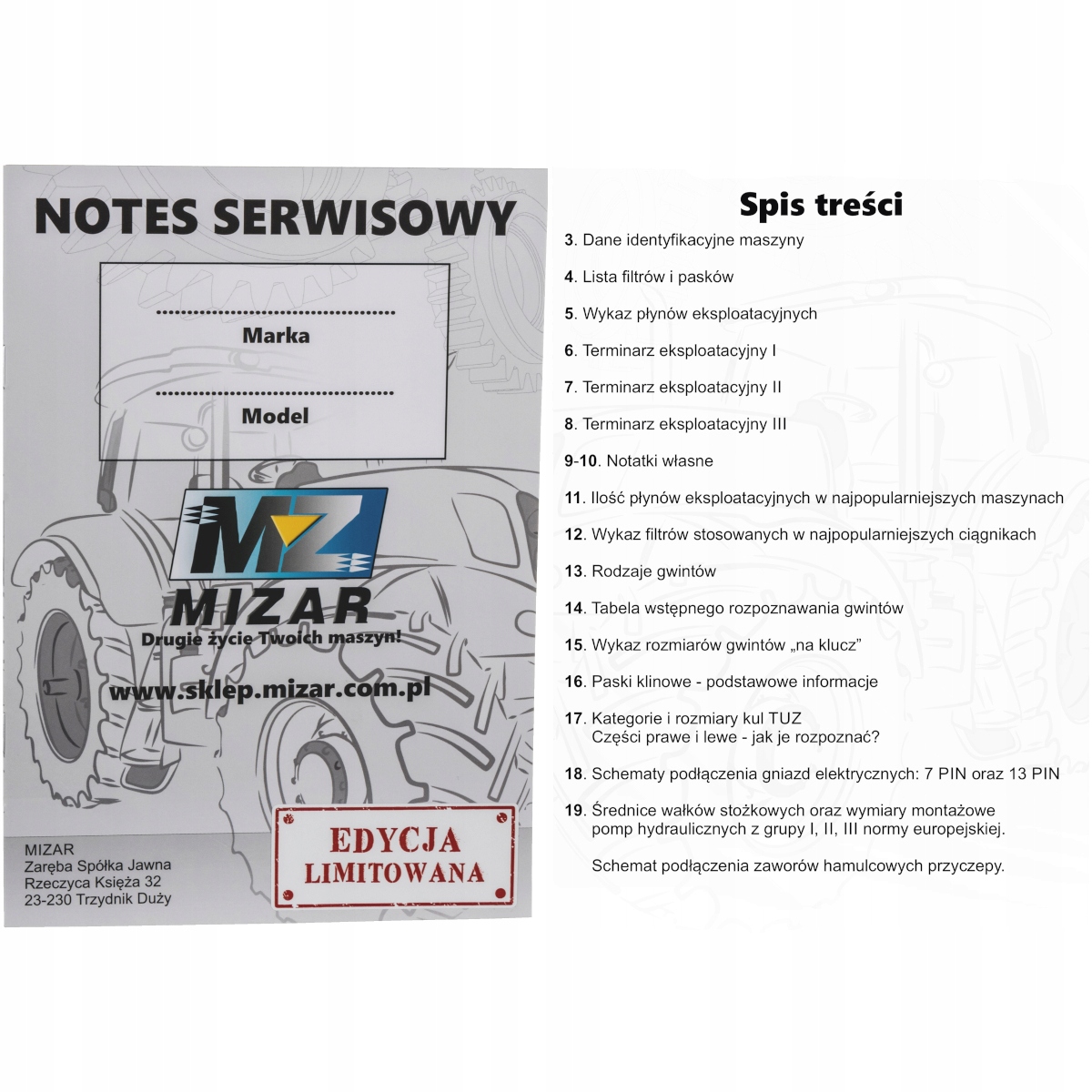 Блокнот містить окреме місце для даних, зокрема такі як: номер VIN, тип двигуна, маркування передньої осі, маркування стартера та генератора та багато іншого. Крім того, робочий графік і місце для власних нотаток полегшать регулярне обслуговування машини.
