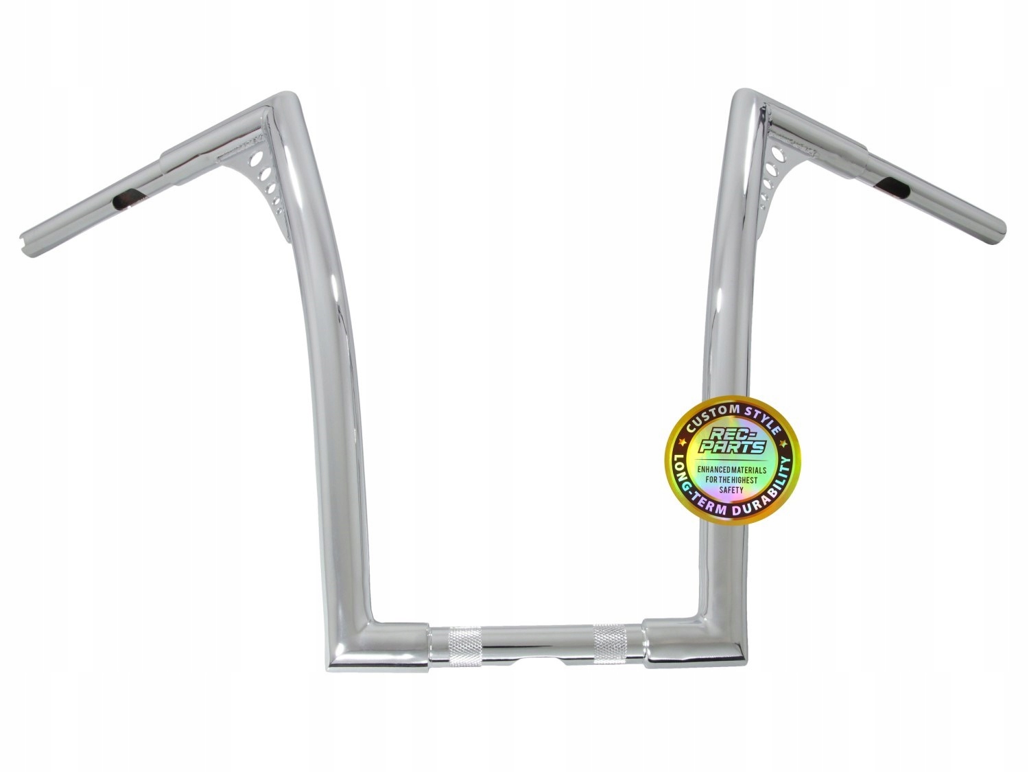 Стандартна товщина 1 дюйм (25,4 мм) у місці кріплення ручок дозволяє встановити ручки на всі мотоцикли з дюймовими ручками (більшість ручок на мотоциклах Harley і мотоциклах чоппер), решта частини керма розширена до 32 мм (за винятком нижньої частини кріплення). Синя стрілка вказує на захисний ковпачок на кермі (при установці важелів ковпачок необхідно зняти). Червона стрілка вказує на отвір для проводки.