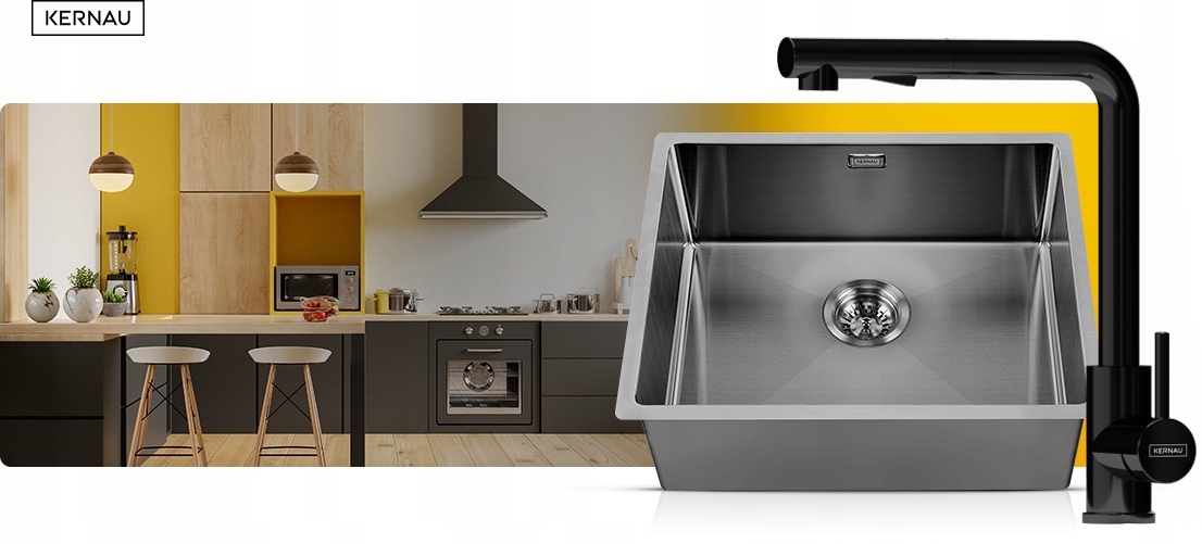 При покупці комплекту Kernau: мийки KSS U 61.1 1B SS Gun metal Steel та змішувача для мийки KWT 33 PO Gun Metal Nano ви отримаєте функціональний зливний комплект за 1 злотий!