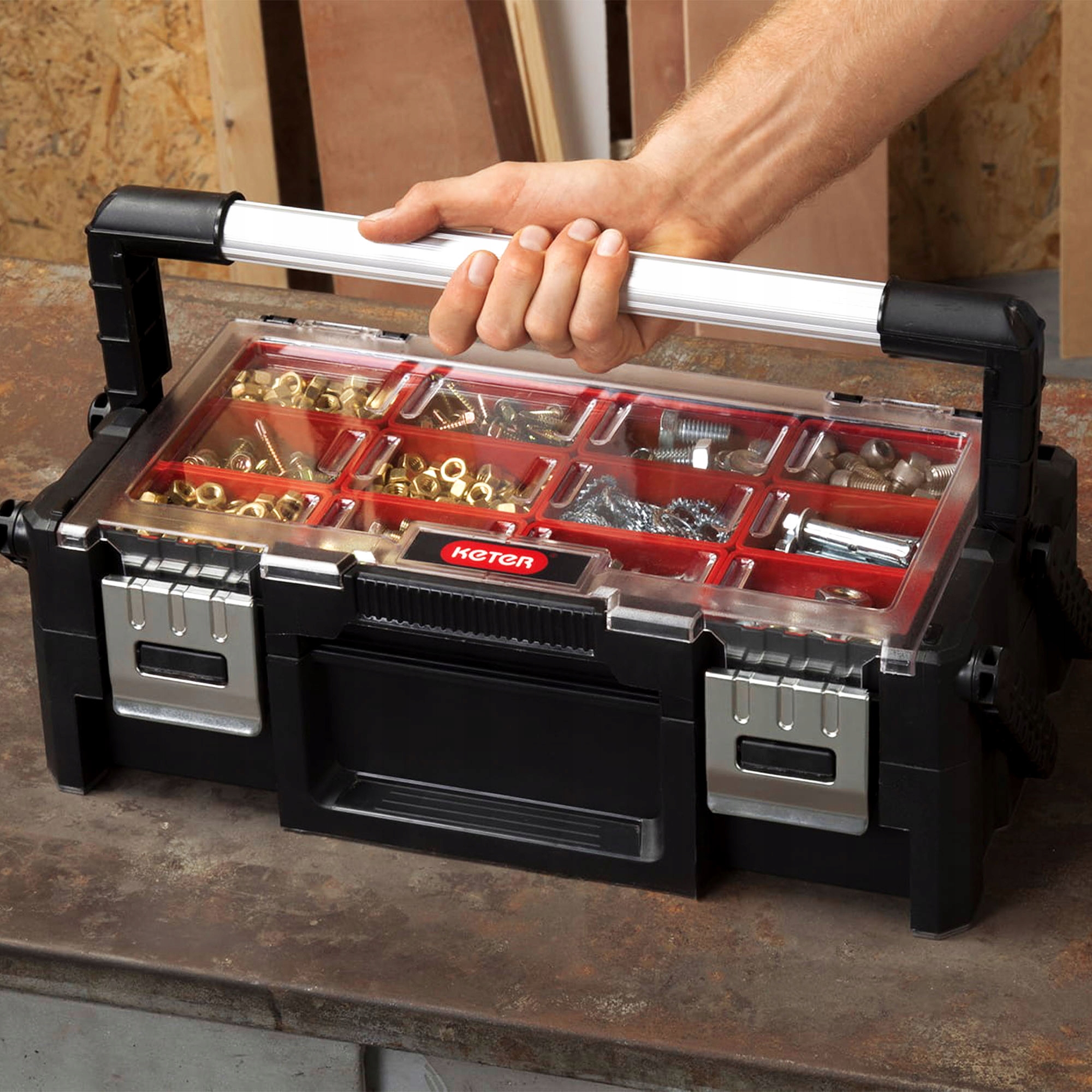 А що про практичний органайзер, який зручний? Ось чому ми оснастили наш ящик для інструментів ергономічною ручкою, яка дозволить вам ефективно переносити його з одного місця на інше. Таким чином, ви уникнете клопоту з перенесенням важких інструментів, тому що ви можете транспортувати все всередині.