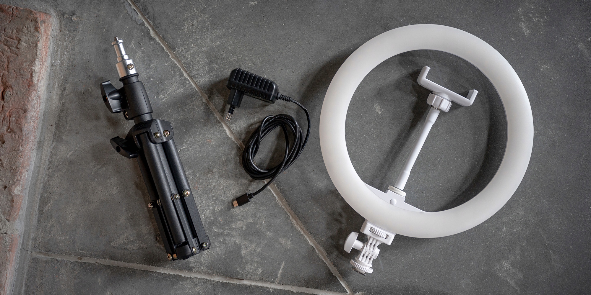 Лампа оснащена невеликою направляючою, яка дозволяє прикріпити смартфон або тримач фотоапарата. Обидва ці аксесуари входять в комплект, тому пристрій буде готовий до використання відразу після розпакування. Тримач для смартфона оснащений гнучкою рукою і кульовою головкою. Завдяки цьому ви можете точно розташувати рамку незалежно від того, який об’єкт буде на вашому фото!