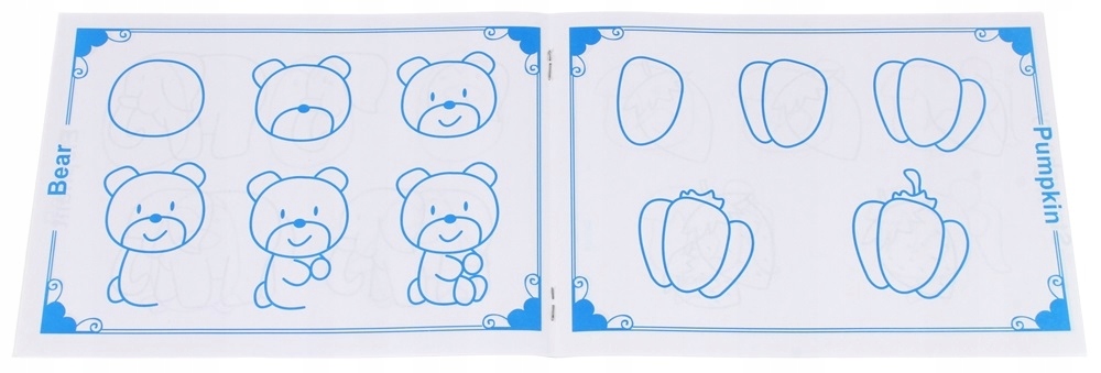 Навколо області малювання є кольорові малюнки, які показують, як легко малювати, наприклад, фрукти, літери, тварин тощо. Поруч із зображеннями їхні назви англійською мовою. Під час гри дитина вивчає форми, кольори та літери.