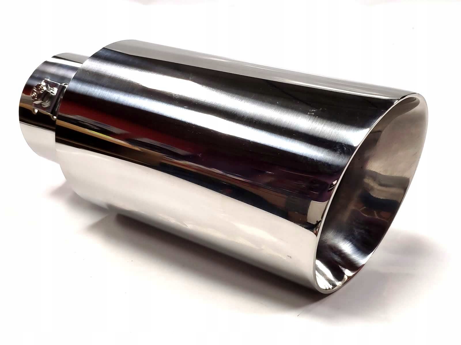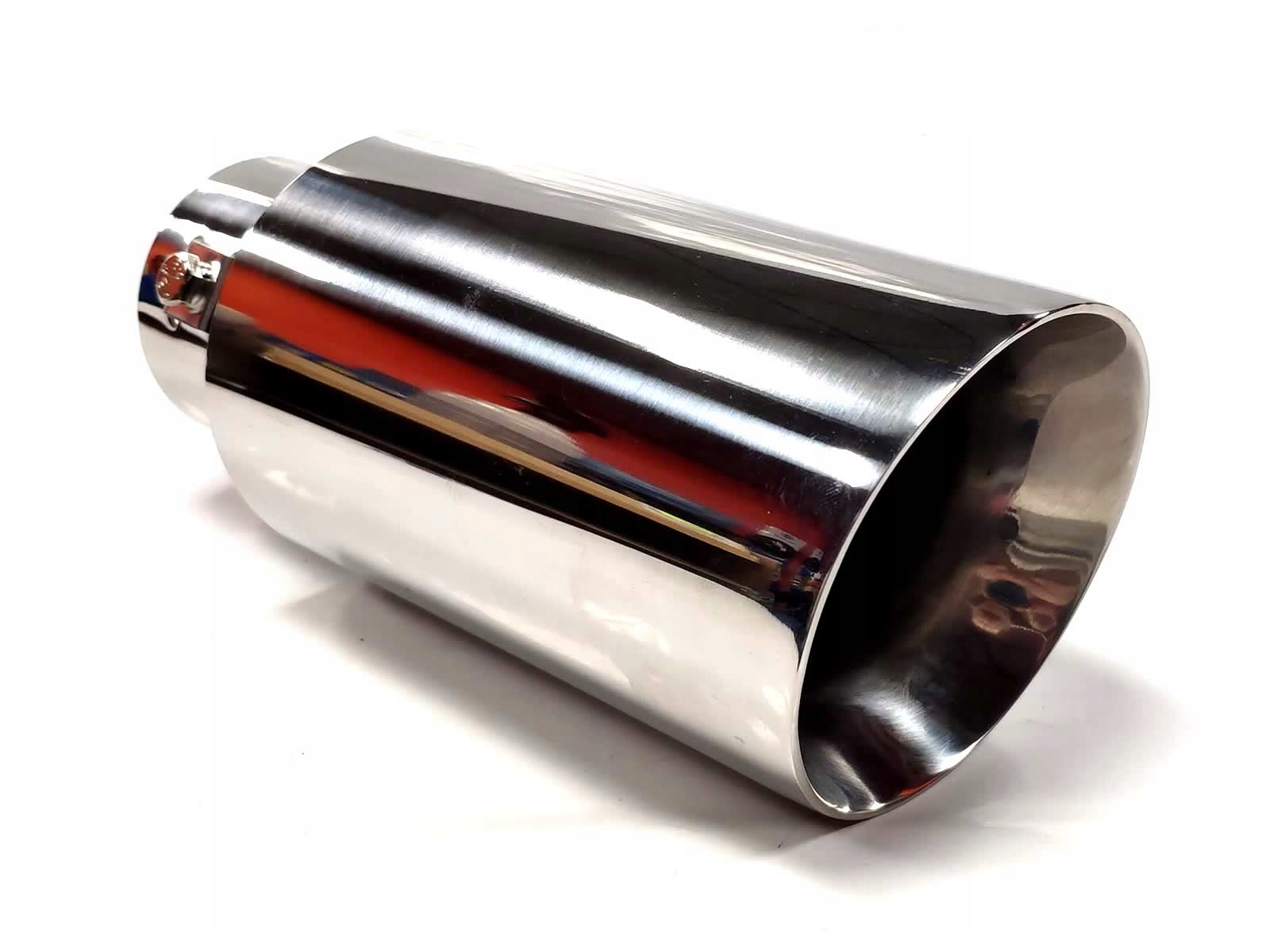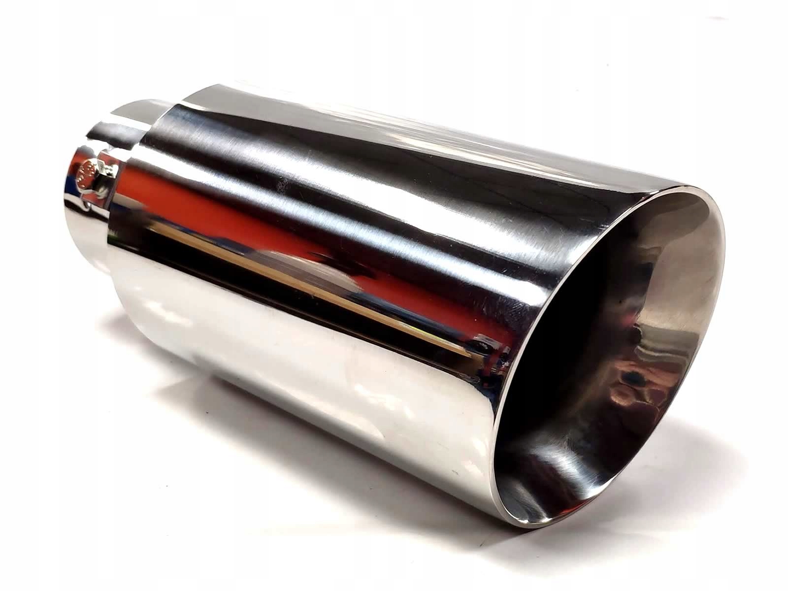 Наконечник глушника круглої форми, скошений, діаметр 90 мм і довжина 200/180 мм (верх/низ), діаметр з боку кріплення 60 мм. Виготовлений з високоякісної полірованої нержавіючої сталі, що забезпечує стійкість до погодних умов, вихлопних газів і високих температур.
