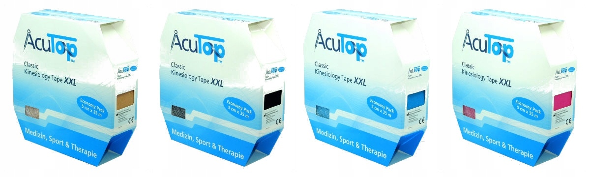Тейпи AcuTop мають унікальну хвилеподібну форму, яка стала стандартом у сфері терапевтичного тейпування. Вони забезпечують неінвазивний та ефективний метод відновлення нервово-м’язової системи, одночасно покращуючи крово- та лімфообіг, заспокоюючи біль і забезпечуючи комфорт і стабілізацію, необхідні під час терапії пацієнта. Ширина 5 см дозволяє вирізати більшість аплікацій. Його можна легко використовувати для всіх чотирьох найпопулярніших методів кінезіотейпування («I», «Y», «X», «F»). Ця стрічка ідеально підходить для використання на всьому тілі, а спеціальні лінії спрощують розрізання та застосування.