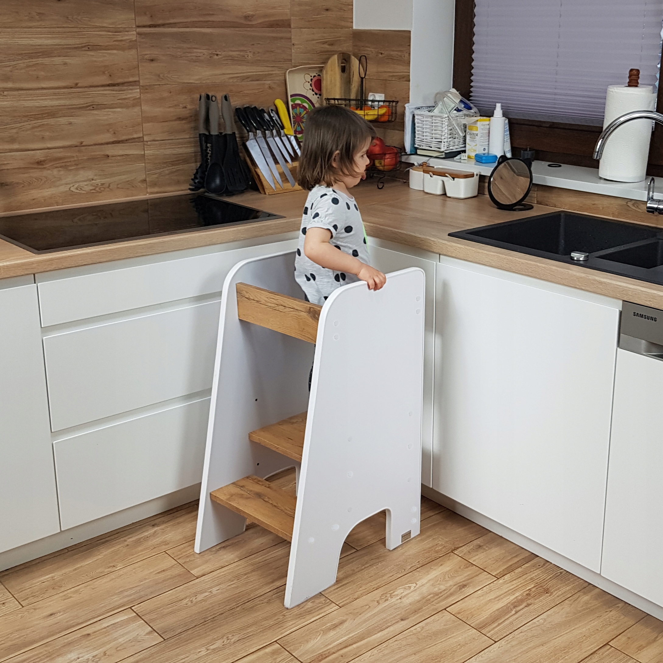 Наш кухонний помічник - це твердий продукт, який повністю виробляється в Польщі. Ми зробили його з ламінованої ДСП, тому він не важить багато, тож ви можете легко переміщати його куди завгодно. Ми покрили все це м’яким ПВХ, щоб жоден гострий край чи стирчить осколок не загрожували малюкові. Усі шурупи закриті самоклеючими ковпачками, які входять у комплект.