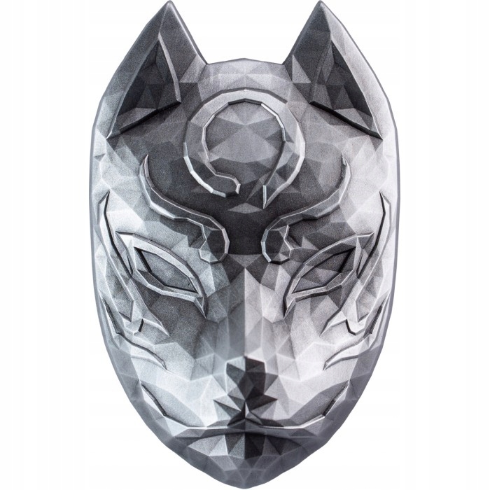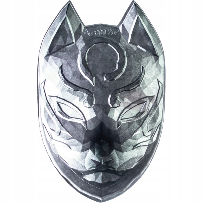 Кіцуне — колекційний срібний предмет у формі маски вагою 2 унції. Монета викарбувана зі срібла 999 проби з ультрависоким рельєфом і має античне покриття.
