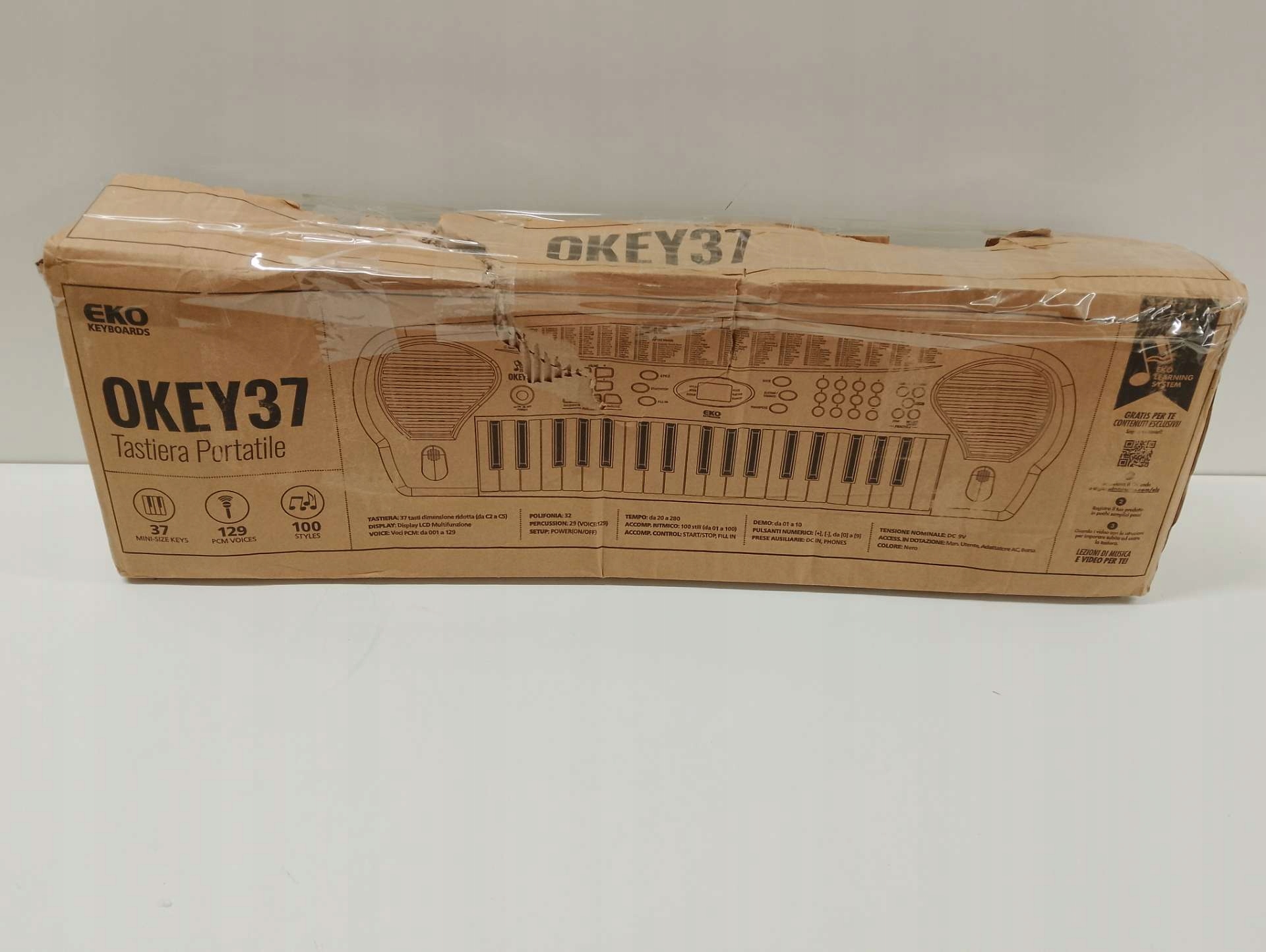 okey 37 Технічні дані: клавіатура: 37 клавіш Mini-розміру (від C1 до C5) Дисплей: Багатофункціональний РК-дисплей Звуки: 129 Голосова PCM Поліфонія: 32 Коментарі Звуки: Перкусія, Систейн, Вібрато, Трансатом (38-40 півріччя) Стилі та 100-річний контроль: 10-ти з проміжку: 10-ти з проміжків: 10-ти з проміжків: 10-ти. Мінус один (замовкла мелодія) Кнопки нумерів: [+], [ -], від [0] до [99] арматура: 1 в допоміжному динаміку x 2: постійний струм для живлення за допомогою доданого адаптера, телефони: введення навушників: "c" - не входить до набору), включені: інструкції в італійському, адаптері x 450 X. Вага мм: 1,54 кг (без батарей)