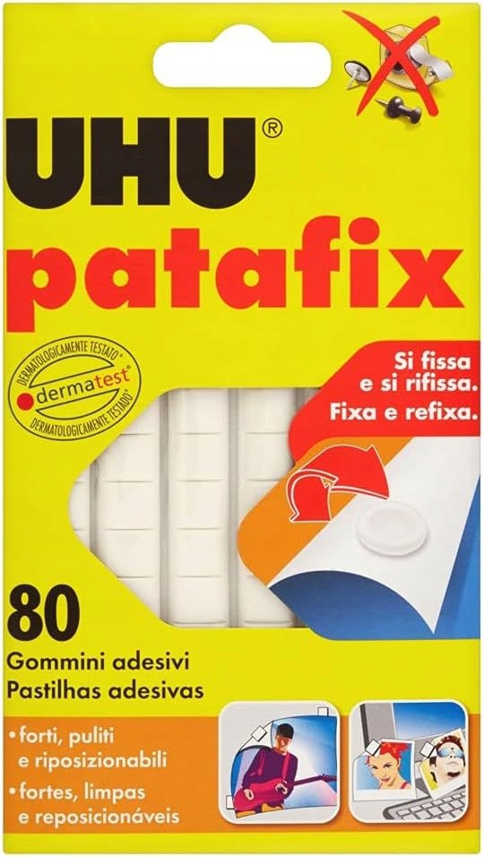 Розумна альтернатива стрічкам і шпилькам. UHU Patafix Princess — це клейова маса для чистого багаторазового приклеювання невеликих об’єктів (малюнків, фотографій) до різних поверхонь, таких як стіни, меблі, двері та тисячі інших поверхонь удома, в дитячому садку та школі.