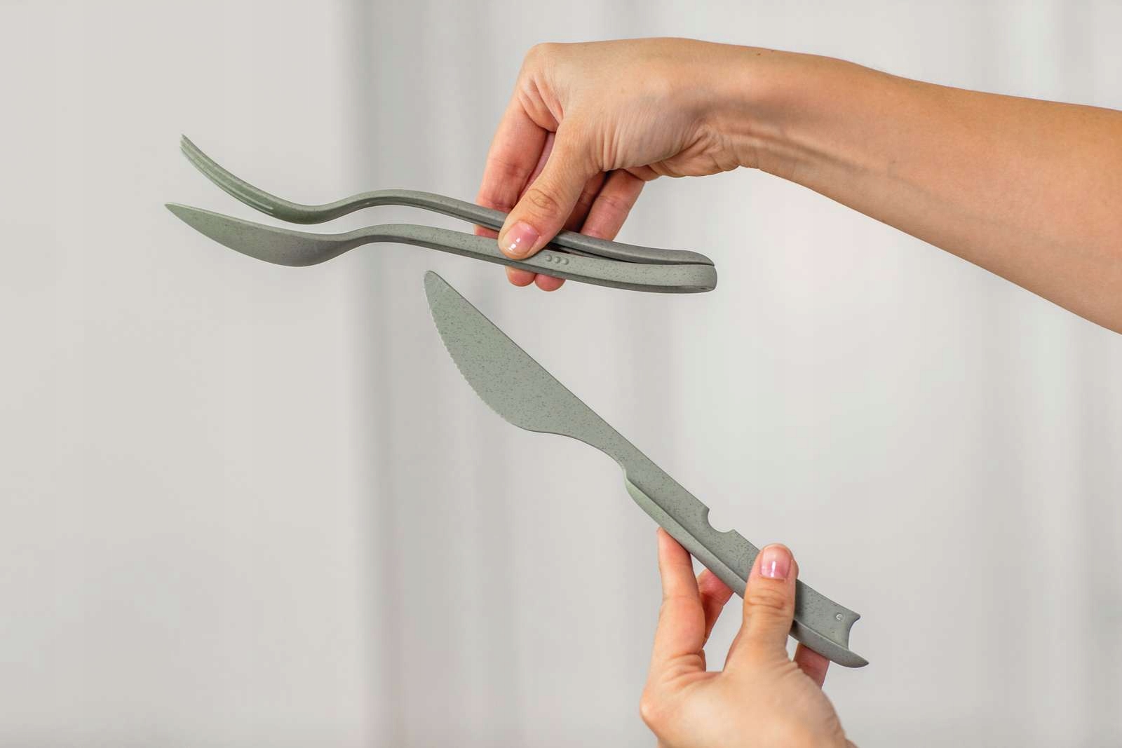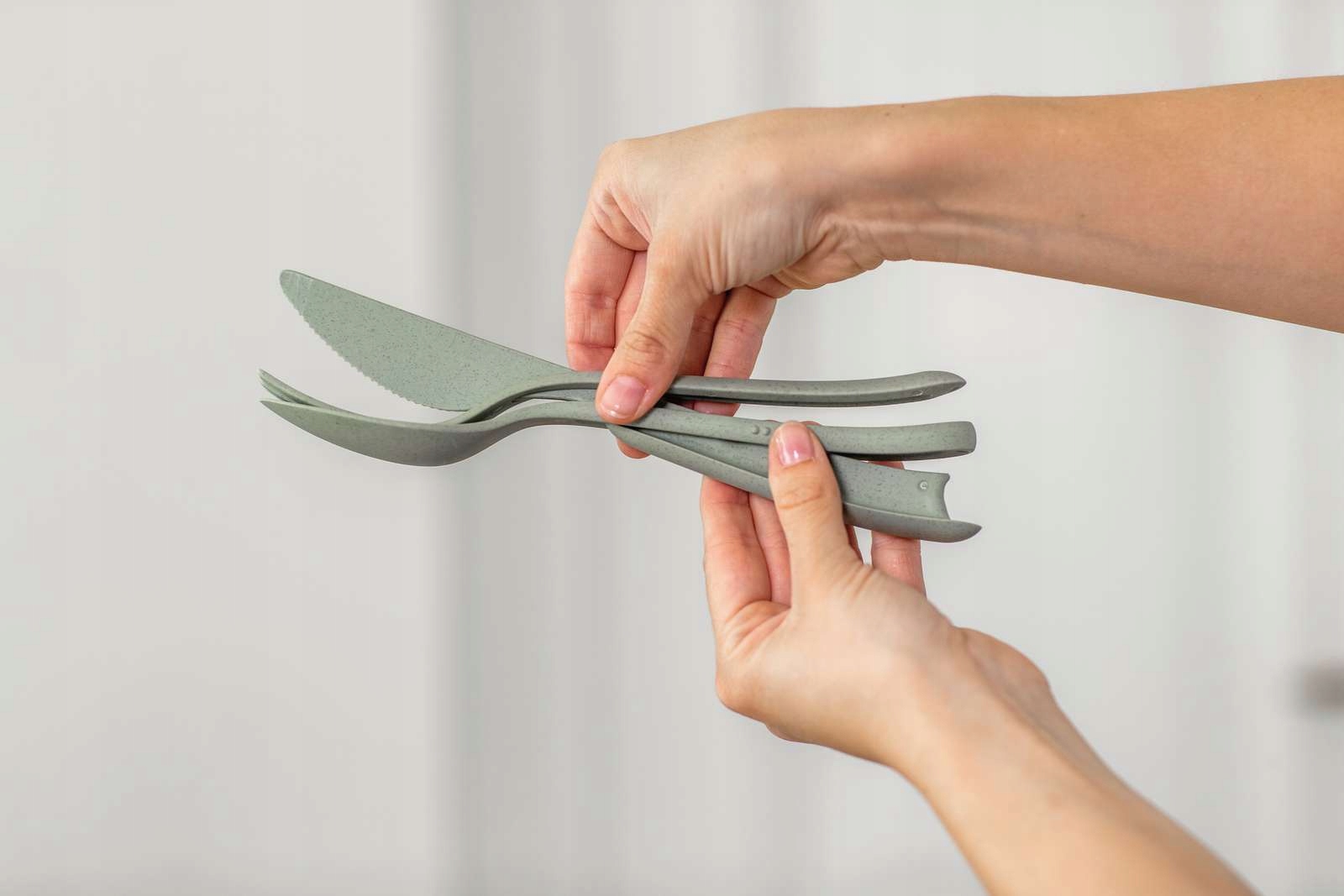 Все, що вам потрібно, - це одне клацання, і ви зберігаєте практичні столові прибори в руці. Другий клацання і перетворюється на невеликий комфортний пакет, який може легко вписатися в обідню коробку.