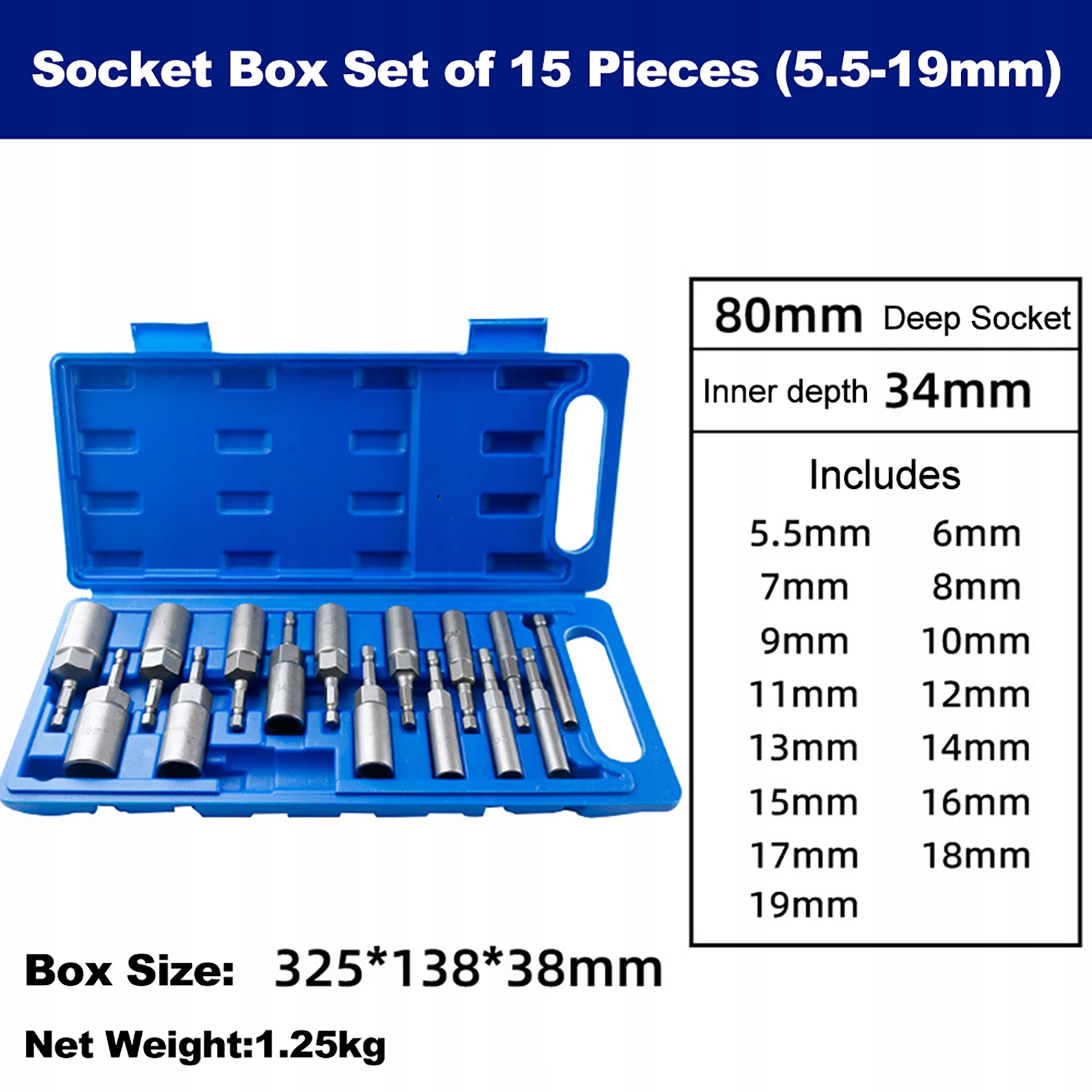- 15 шт. включають: 5,5 мм, 6 мм, 7 мм, 8 мм, 9 мм, 10 мм, 11 мм, 12 мм, 13 мм, 14 мм, 15 мм, 16 мм, 17 мм, 18 мм, 19 мм. рукав