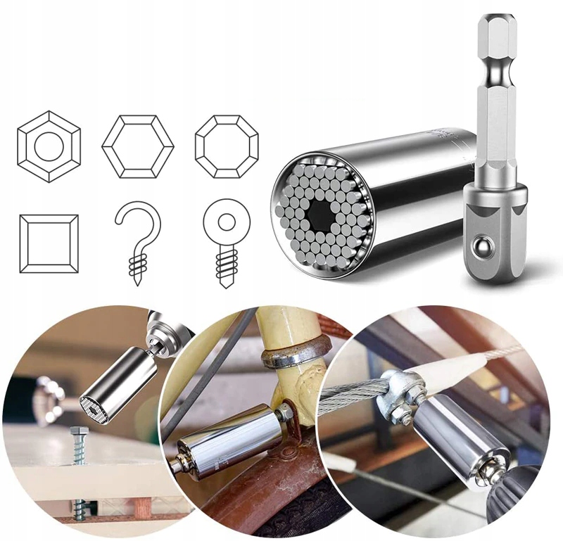 Використовується для закручування болтів і шурупів із різною формою головок, у тому числі фасонних і незвичайних, таких як прямі гаки, гаки з вушками, та ін. Розетка з високоякісної хром-ванадієвої сталі CrV, що відрізняється міцністю і еластичністю. Призначений для роботи з торцевими та ударними гайковими ключами. Унікальний дизайн зі стрижнями, які підлаштовуються під елемент, який загвинчується.