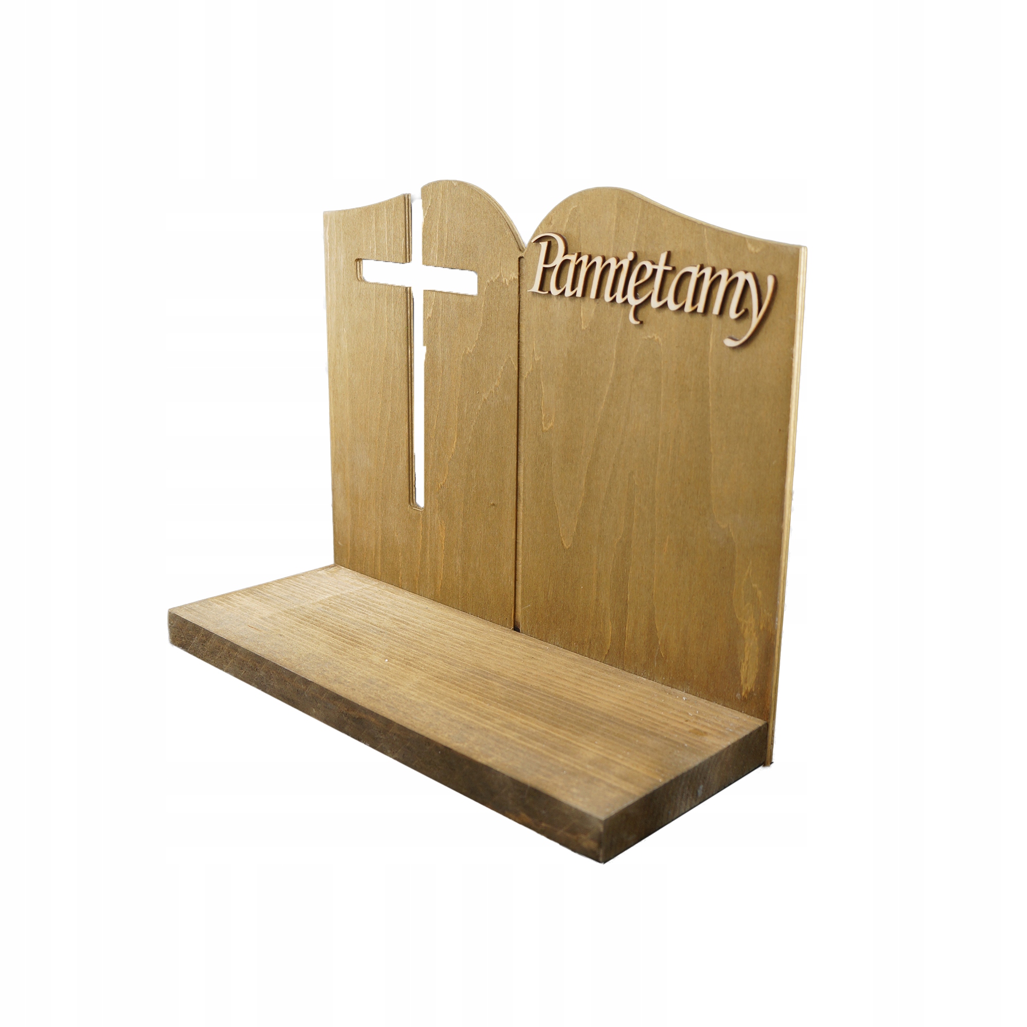 Дерев'яна статуетка у формі книги з прямокутною основою та вирізаним символом хреста та багатозначним написом «Ми пам'ятаємо».