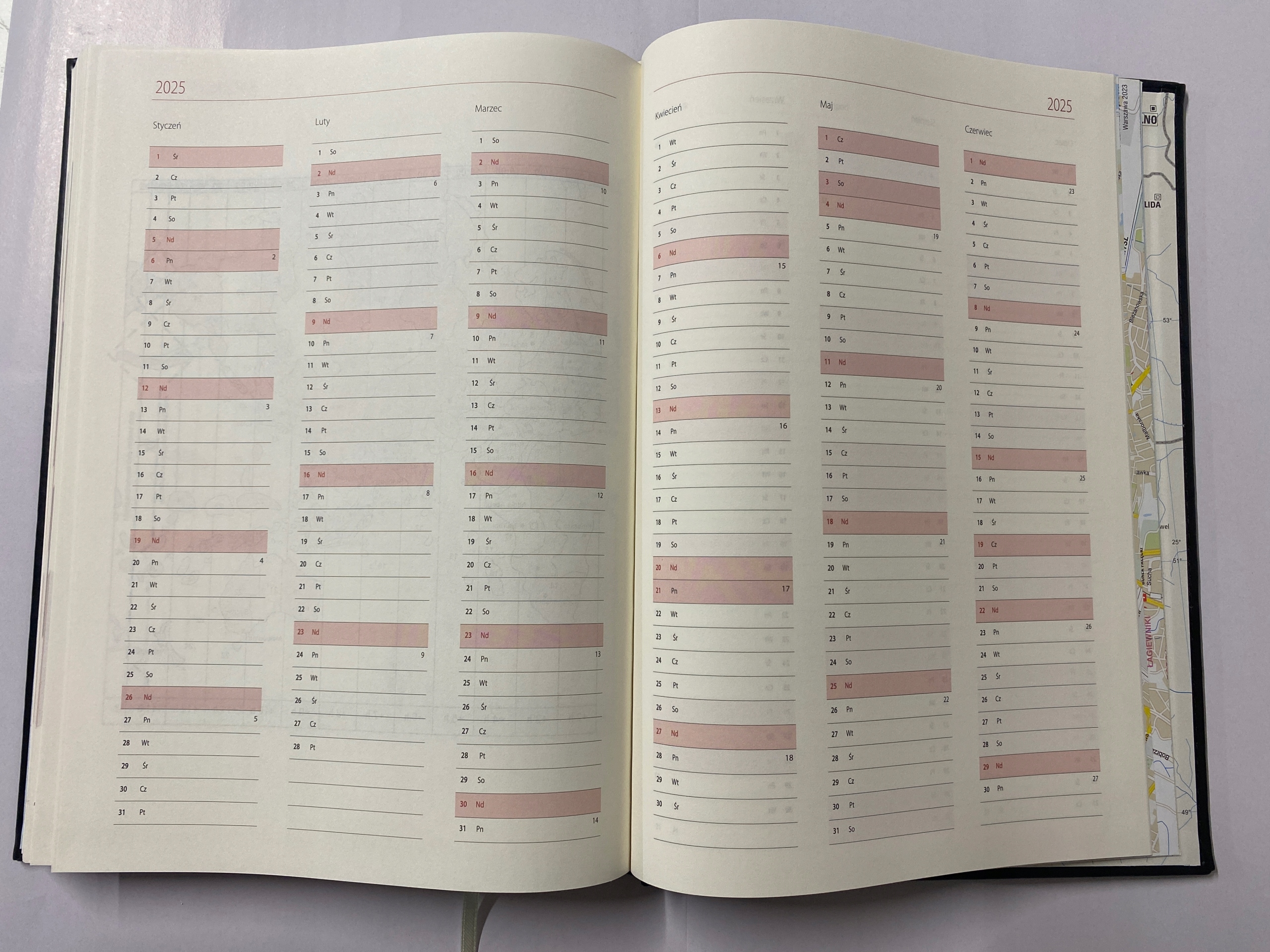 - Макет: 1 день на 1 сторінка, субота та неділя по 1 сторінці, місячний планувальник перед кожним місяцем