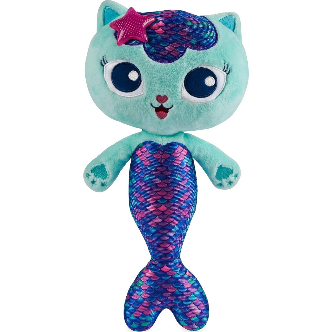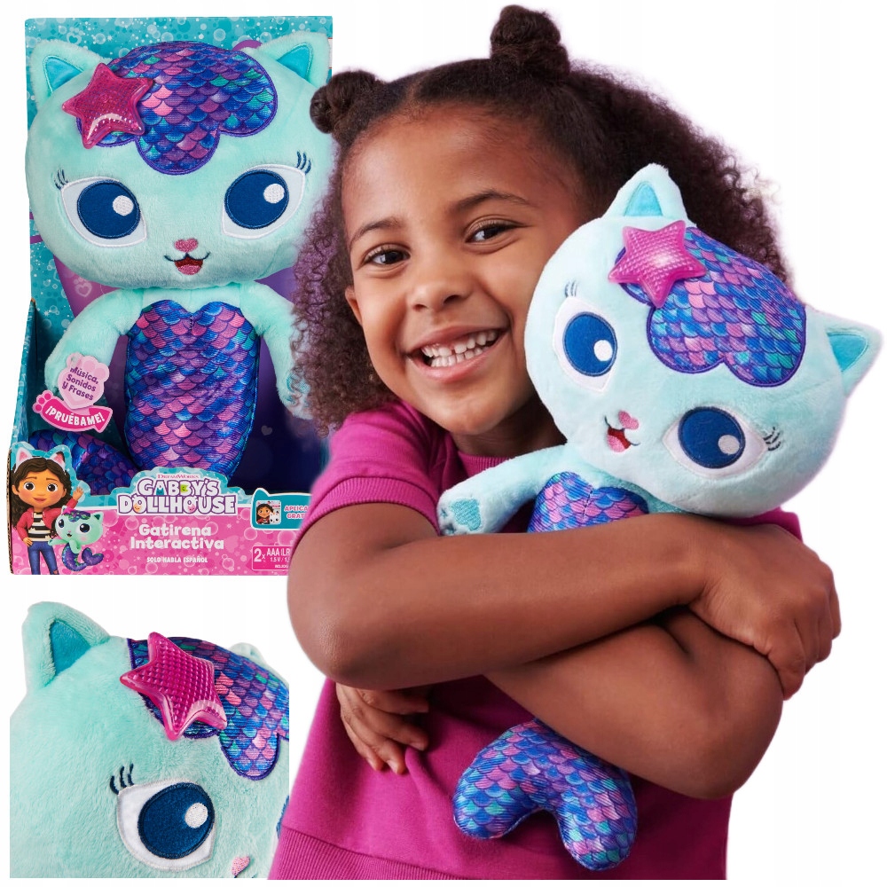 Підготуйтеся до нескінченних іграшок Cuddly з русалкою! М’який і приємний інтерактивний плюшевий кошеня оживає друга Габбі з серіалу! Завдяки вашим загостреним вухам, чарівному хвосту, вишитим деталям та сяючим зірці по голові, русалка - ідеальний супутник для гри та сну!