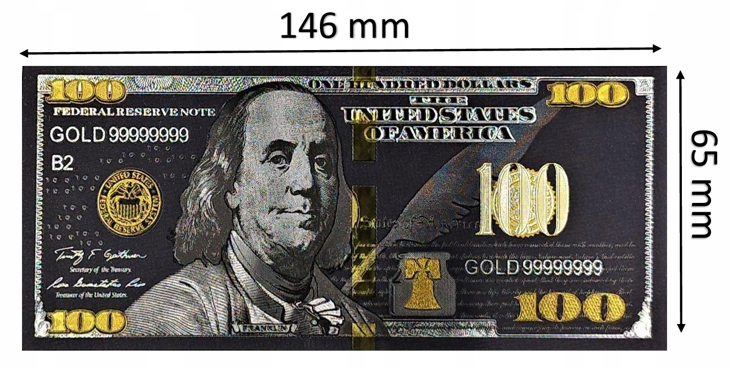 Це точна копія американської банкноти, представленої 2009 р. виготовлено з ПВХ та покрито чорною фольгою з золотими елементами.