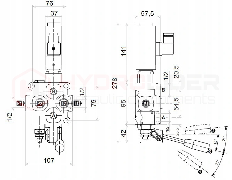 - Подача від насоса (P1, P2): BSP 1/2'' внутрішня різьба