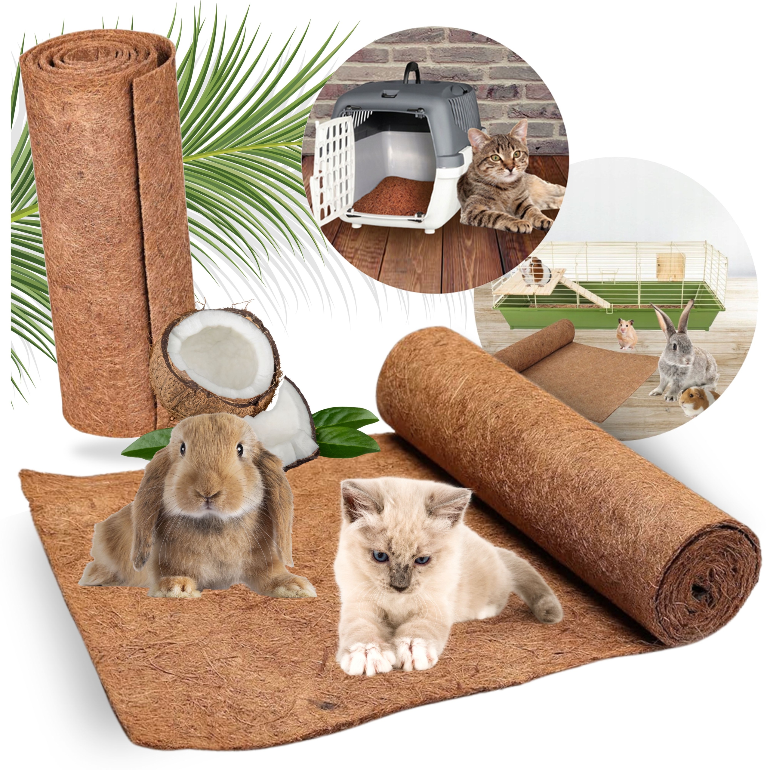 Кокосовий килимок гігієнічний, екологічний і повністю натуральний, виготовлений з кокосових волокон. Він дуже добре вбирає вологу і ефективно усуває неприємні запахи, тому відмінно підходить в якості субстрату для клітин і загонів для кроликів, гризунів та інших дрібних тварин. Килимок практично чистий від пилу - зручний для алергіків. Його можна нарізати на будь-який розмір і форму, що робить його багатофункціональним. Він біологічно розкладається. Його можна компостувати.