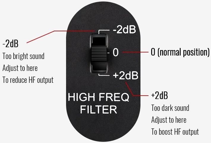 Фільтр високих частот збільшує або зменшує відносну частотну характеристику для регулювання чіткості звуку. Регульований конструкція акустичного фільтра оптимізує ефект моніторингу.