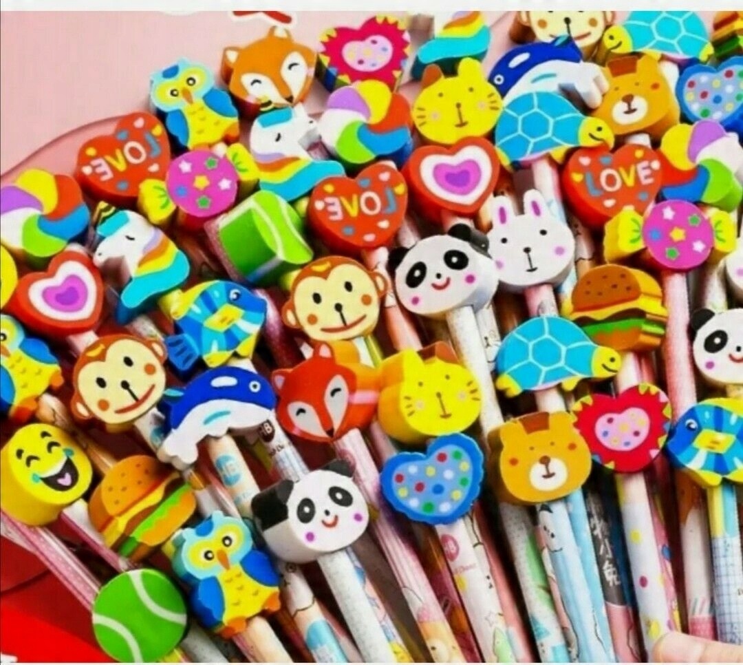 Набір кольорових олівців та олівців для малювання декоративними гумками. Кожен олівець і олівець мають кінчик гумки, на кожному з яких зображено різний малюнок тварин. Кожна гумка підходить до олівця або крейди, на якій вона розміщена.