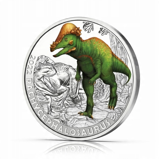 Мідна монета номіналом 3 євро 2022 року у вигляді пахіцефалозавра є номіналом із серії «Суперзаври» номіналом 3 євро. Пахіцефалозавр — одинадцята монета серії. Пахіцефалозавр був травоїдним динозавром, який жив у пізньому крейдяному періоді в Північній Америці 70 мільйонів років тому. У перекладі з грецької назва динозавра означає «товстоголовий ящір», товщина якого становила 25 см. Висота динозавра досягала 4,5 м, а вага – до 1000 кілограмів. Монета походить від відомого монетного двору Австрії. Мідна монета 2022 року не має штампованої ваги та проби металу. Валюта є законним платіжним засобом в Австрії. На Аверсі показано 12 зображень доісторичних тварин із серії «Суперзаври». На аверсі також розміщено номінал монети та напис «REPUBLIK ÖSTERREICH». На реверсі зображено кольорового пахіцефалозавра, що біжить. На реверсі розміщено напис «PACYCEPHALOSAURUS» і рік карбування монети. Реверс монети світиться в темряві.