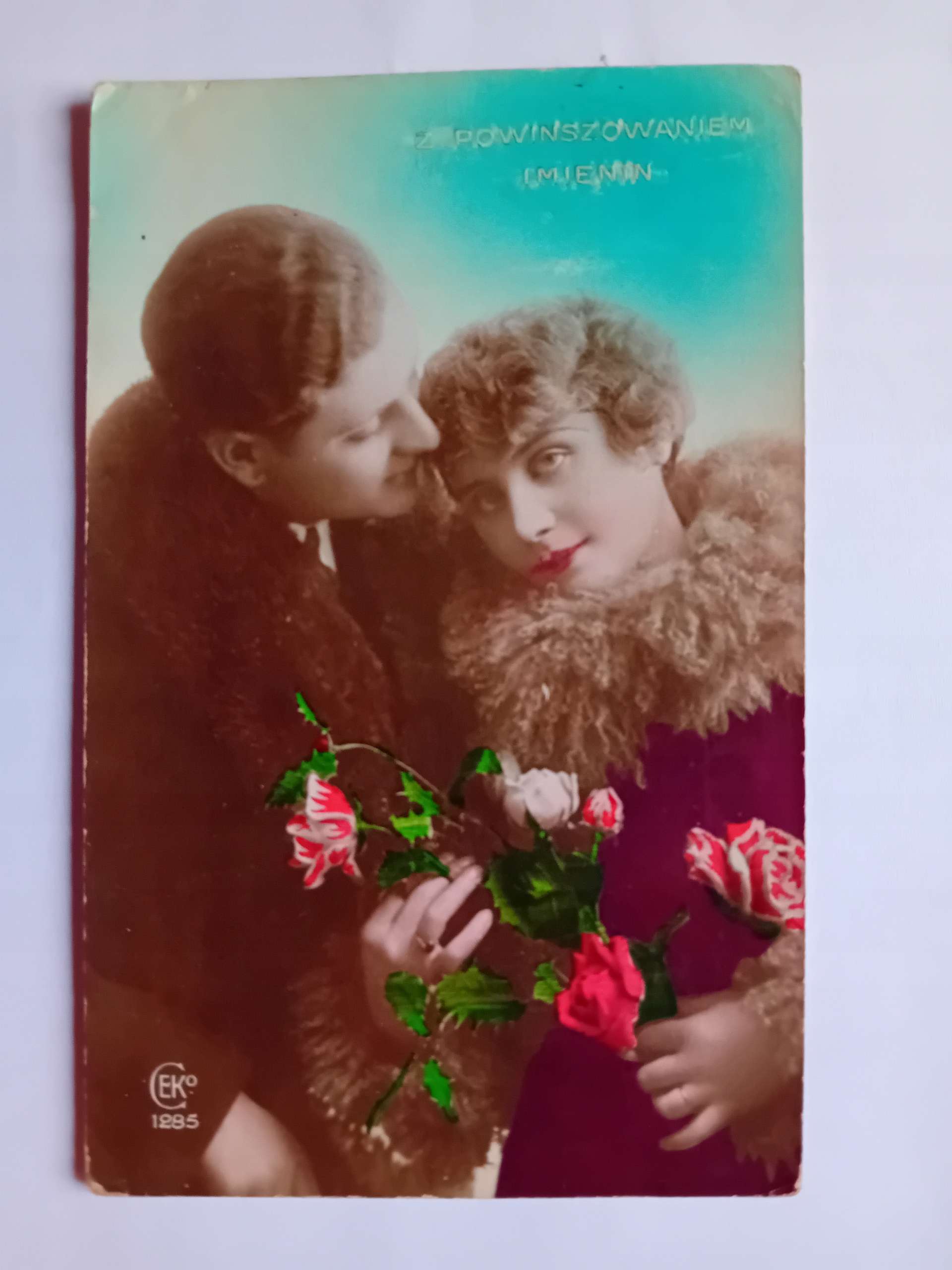 Kolorowa widokówka Z powinszowaniem imienin. Francja, 1930 r.