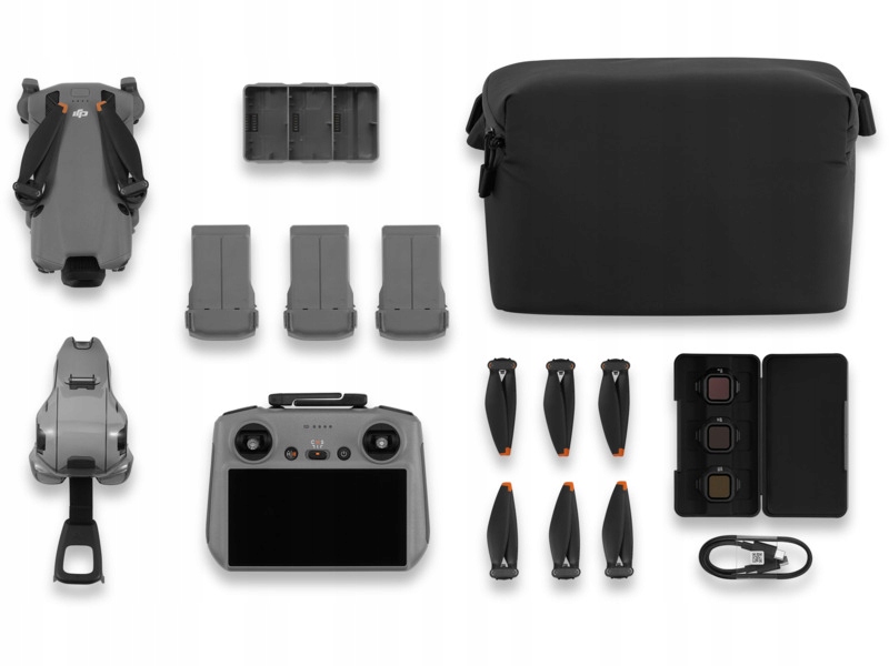 - Equipment: 3 x запасні гвинти (пара), акумулятор (3 шт.), DJI RC 2 управління апаратом, зарядка Hub USB-C, кришка зберігання, DJI плеча, ND-набір фільтра (ND8/32/128)