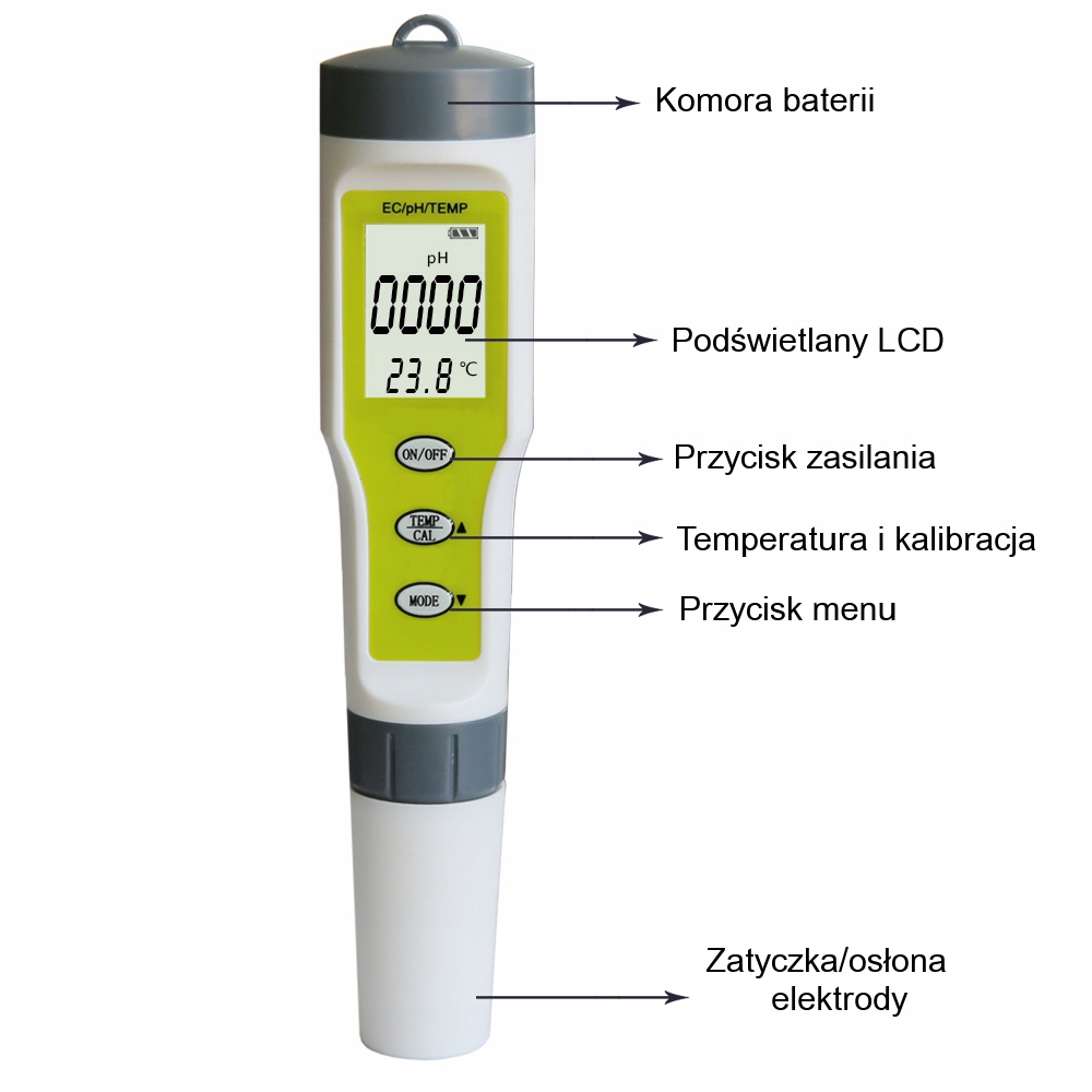 Combo 3IN1 pH/EC/температурний вимірювач. Прилад, призначений для вимірювання електропровідності водних розчинів (мкСм), реакції рідини (pH) і температури (°C, °F). Щоб заощадити батарею, пристрій автоматично вимикається через 5 хвилин бездіяльності.