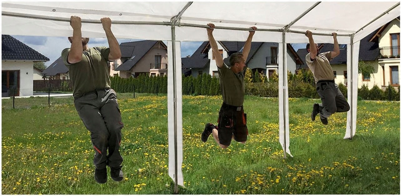Виріб не стійкий до снігу. Конструкція має обмежену стійкість до вітру. Намет тимчасового користування, використовувати тільки коли дозволяють погодні умови.