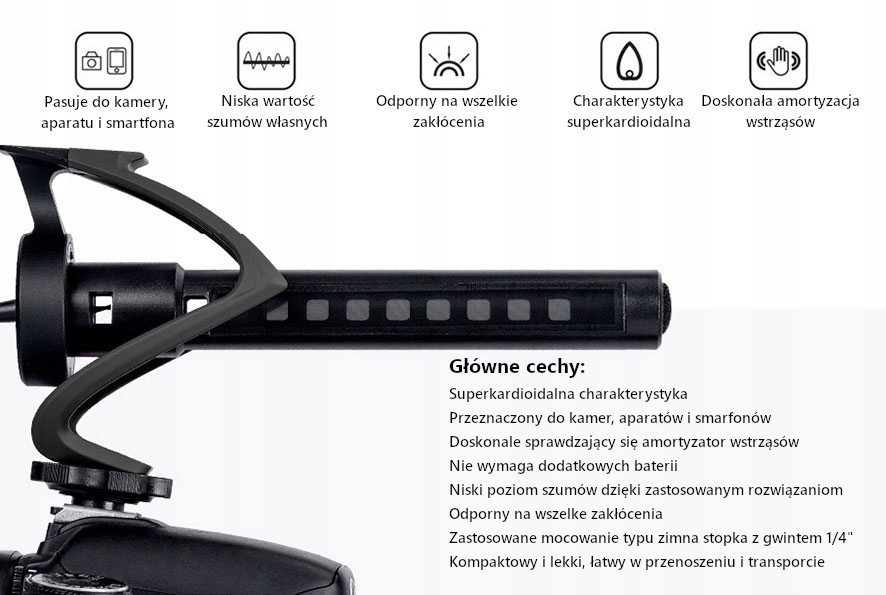 Завдяки суперкадоїдним характеристикам мікрофон записує звук лише в передній частині мікрофона, ефективно відокремлюючи небажані звуки навколишнього середовища. Крім того, він був оснащений запатентованою ізоляційною ручкою по ударах та вібраціями. Завдяки цим рішенням ми маємо повний контроль над записаним матеріалом.