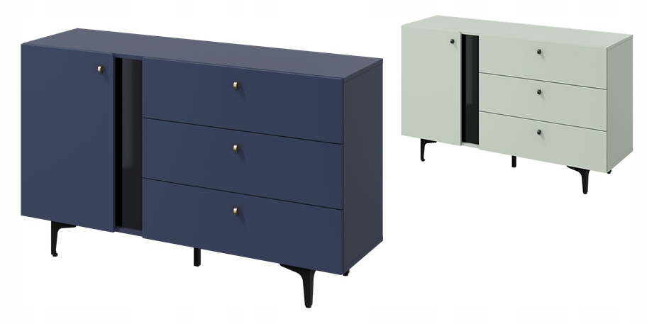 Класична функціональність комода робить предмет меблів для багатьох кімнати, в т.ч. у вітальні, спальні, гардеробній, холі або невеликій квартирі-студії. Комод оснащений трьома місткими ящиками для білизни або документів і шафою з дверцятами. Можна розмістити прикраси на стільниці або облаштувати міні-туалетний столик. Комод також може служити тумбою під телевізор. Комод відрізняється оригінальним дизайном. Виразний темно-синій колір цікаво поєднується з деталями блискучого чорного кольору. Сучасний стиль меблів також завдяки модним тонким ніжкам і маленьким золотистим ручкам. Варто звернути увагу на незвичайно закруглені краї фасадів, які підкреслюють унікальний стиль комода. Меблі виготовлені з міцного ламінованого картону, кромки оброблені ABS. Двері оснащені системою плавного закриття. Комод також доступний у кольорі шавлія.