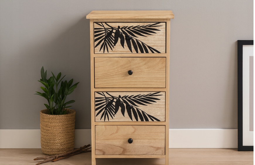 Комод ZOFIA - це поєднання природної елегантності та практичного дизайну. Виготовлена з легкої, але міцної деревини павловнії, вона радує своїм природним відтінком і тонким мотивом листя, що додає інтер'єру затишку та екзотичної атмосфери. Ідеально підходить для спальні, вітальні чи холу - скрізь, де важливі стиль і порядок