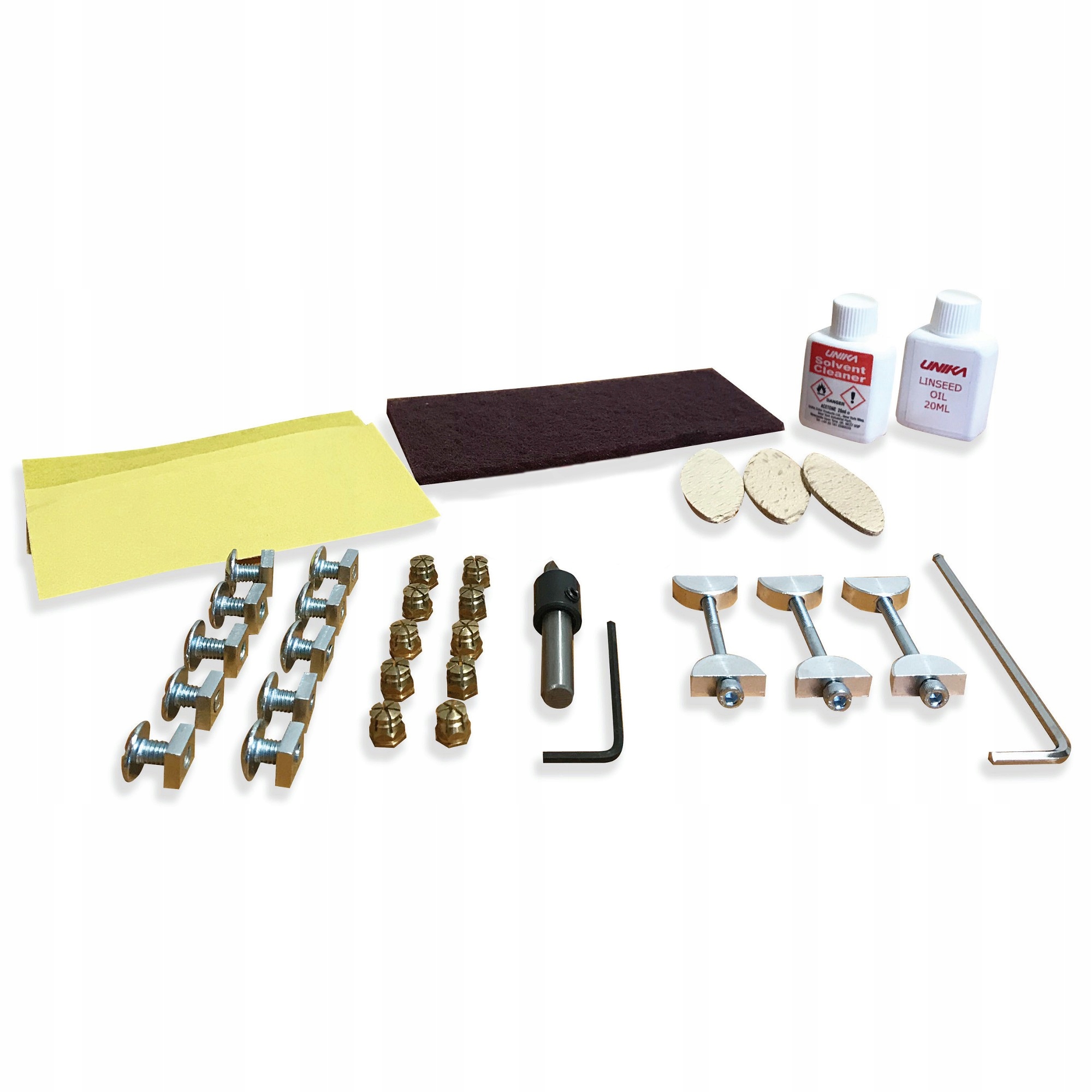 Кутові з'єднання компактних стільниць повинні бути виконані за шаблоном Unika для компактних стільниць. Цей шаблон підходить для будь-якої фрези з фрезою діаметром ½" (12,7 мм) і напрямним кільцем 30 мм. Повні інструкції щодо використання шаблону додаються разом із шаблоном. Після фрезерування стільниці та гнізд для з’єднувальних гвинтів рекомендується відфрезерувати гнізда для планок (№ 20). Вони повинні розташовуватися між гвинтами, що з'єднують верхи, в обох з'єднаних верхах. Використання планок забезпечить правильне вирівнювання з’єднаних стільниць відносно один одного. Перед з’єднанням кожен відфрезерований край слід відполірувати нейлоновою подушечкою зернистістю 320, що входить до комплекту, а потім очистити невеликою кількістю ацетону для видалення пилу та/або жиру. З'єднання спочатку слід перевірити «насухо», але за допомогою шурупів і ламелей. Якщо з’єднані верхи добре підходять один до одного і все з’єднання є прийнятним, верхи слід від’єднати, а гвинти та планки видалити. Відкрийте тюбик герметика ColorJoint відповідного кольору і накрутіть на наконечник спеціальний аплікатор, що входить до комплекту, як показано на фото. Аплікатор призначений для того, щоб монтажник міг видавити необхідну кількість герметика на оптимальній відстані від краю стільниці. Це забезпечує рівномірний розподіл герметика в зазорі після з’єднання стільниць, що забезпечує ідеальне водонепроникне з’єднання. Проведіть аплікатором по краю стільниці, обережно стискаючи трубку, поки клей не покриє всю довжину краю. Вийміть аплікатор із тюбика та видавіть невелику кількість засобу в кожну щілину під планками на обох з’єднаних стільницях. Потім помістіть рейки в прорізи однієї стільниці. З'єднайте обидві вершини разом. Надлишки герметика ColorJoint будуть видавлені. Вставте гвинти для з’єднання верхівок у гнізда та затягніть їх шестигранним ключем на 3 мм, намагаючись не затягнути різьблення. Перш ніж видалити надлишок герметика ColorJoint з поверхні стільниці, перевірте з’єднання на наявність нерівностей. Поп