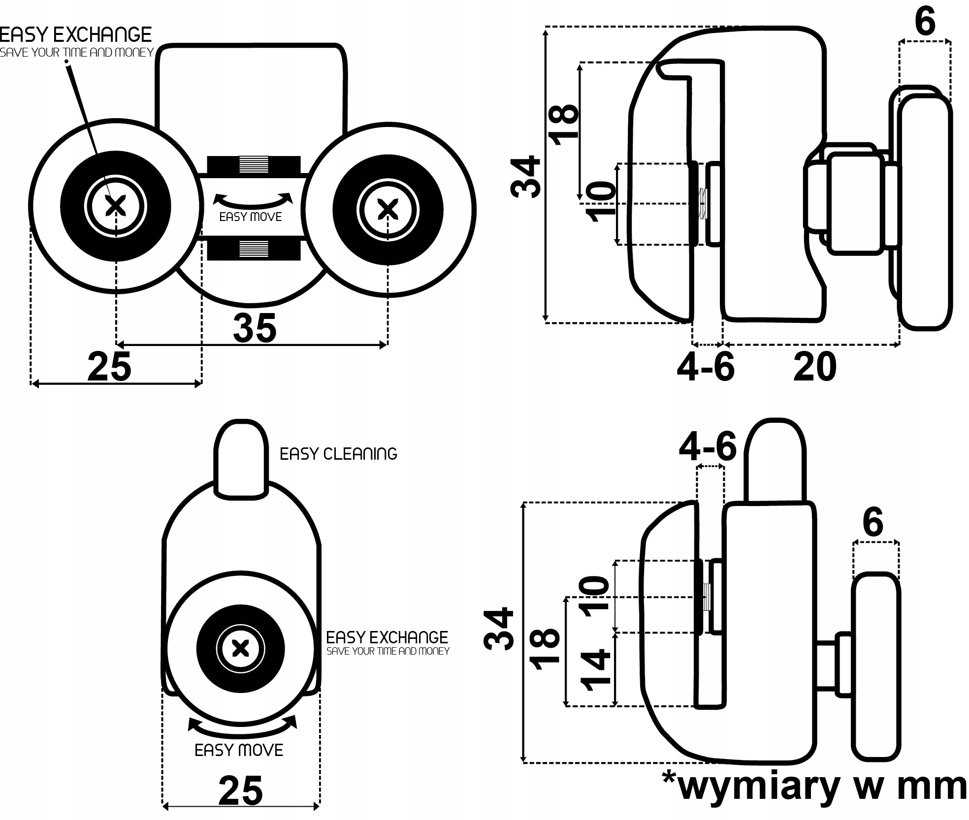 Пропонований нами комплект дозволяє замінити лише колеса, коли це необхідно, без необхідності демонтажу ролика, що економить гроші.